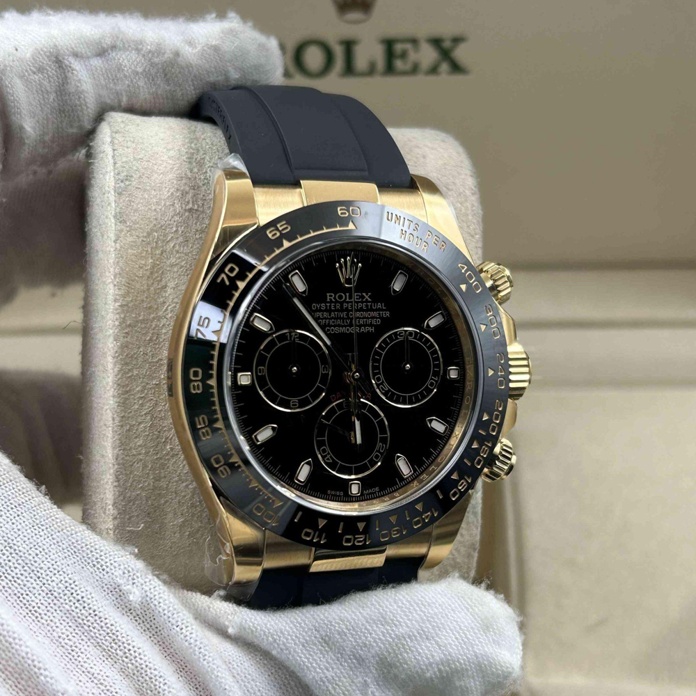 ベゼル:頑丈なブラックのモノブロック・セラミックベゼルが固定されており、タキメータースケールが刻まれています。数字と目盛りは18Kイエローゴールドでコーティングされており、すべての細部においてオリジナルのロレックスデザインと一致しています。