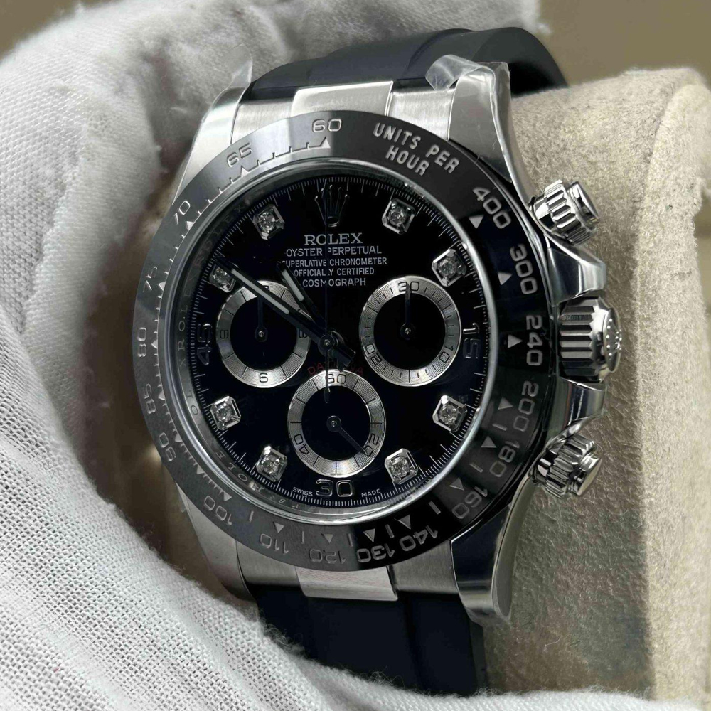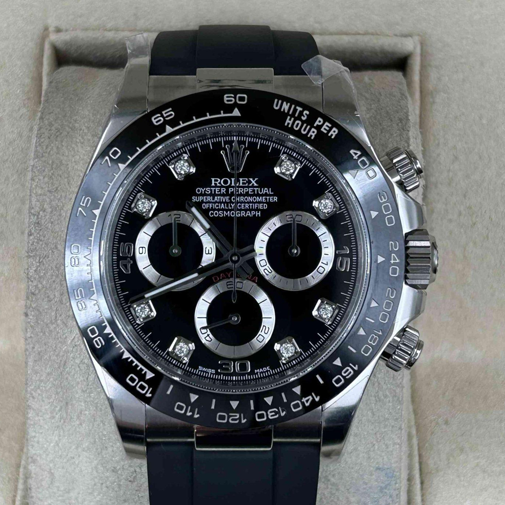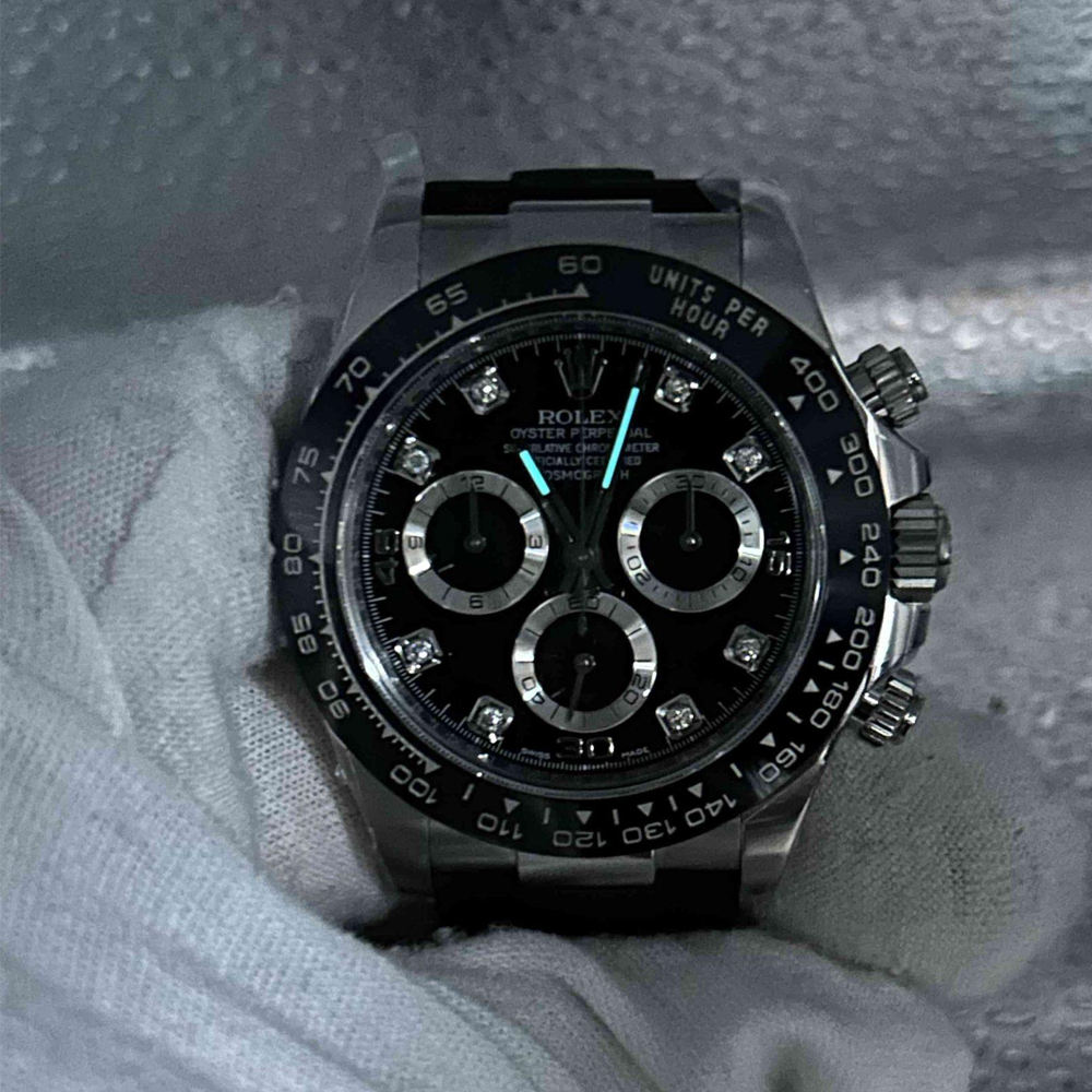 ベゼル:頑丈なブラックのモノブロック・セラミックベゼルが固定されており、タキメータースケールが刻まれています。数字と目盛りは18Kホワイトゴールドでコーティングされており、すべての細部においてオリジナルのロレックスデザインと一致しています。