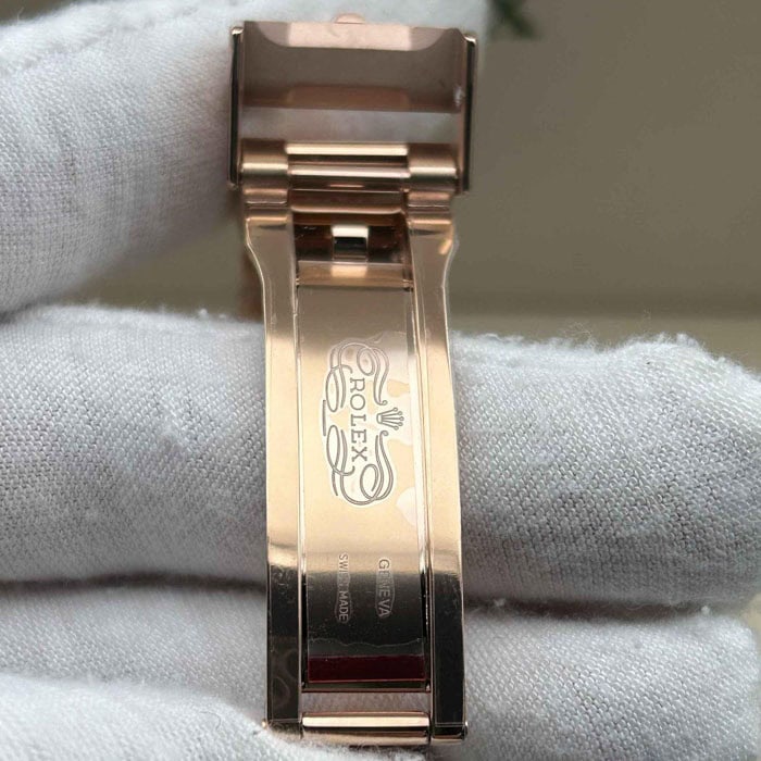 時計には、頑丈なねじ込み式リューズ、スイス製ラバーシール、そしてRehautに「ROLEXROLEX」という刻印が施されています。