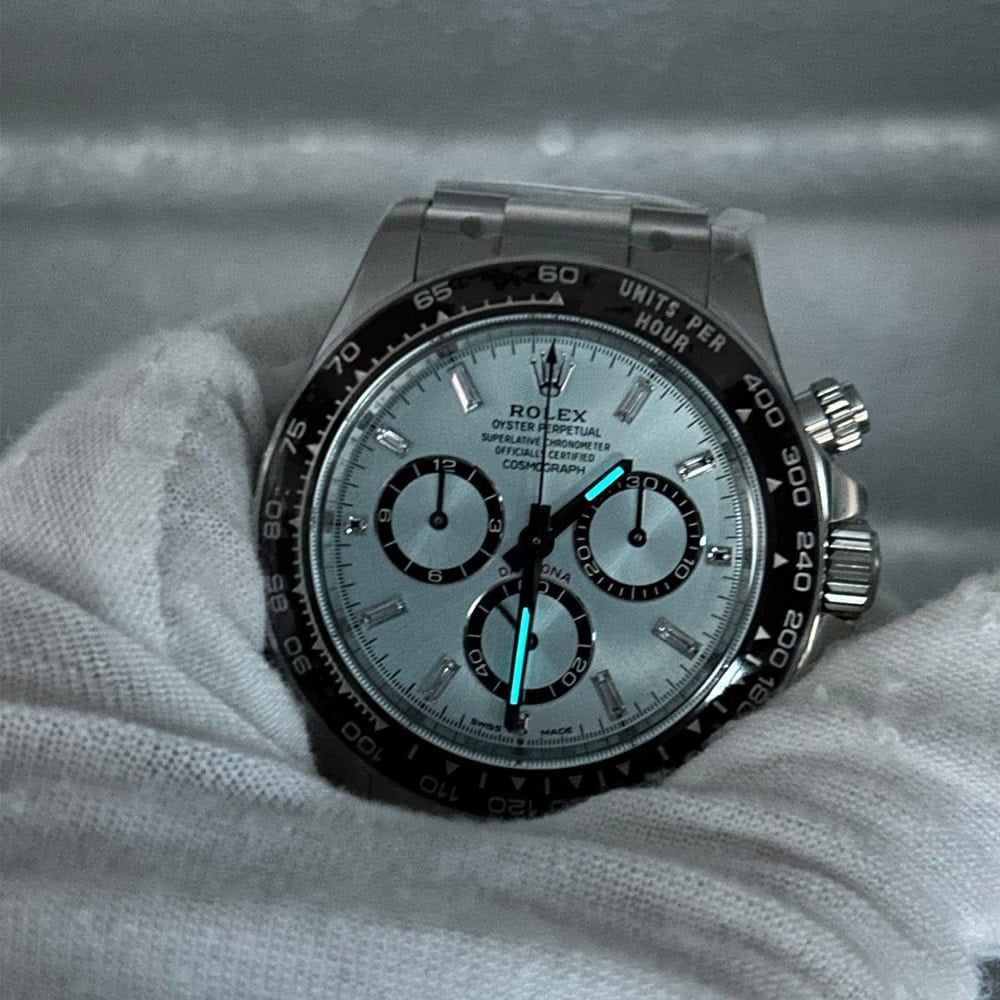 文字盤:アイスブルーの文字盤はモアサナイト・ダイヤモンドのアワーマーカーが特徴で、高級感あふれるデザインを採用しています。 バゲットカットのモアサナイト・ダイヤモンド8個と、3時、6時、9時の位置に配置された3つのダイヤモンドアワーマーカーが含まれます。 針はスーパールミノバブルールミネッセンス蓄光塗料でコーティングされており、9時間まで均一に明るく発光できます。 クリーンファクトリーでは、文字盤のすべてのテキスト、プリント、刻印がオリジナルと同様に正確であり、読みやすさを保証しています。