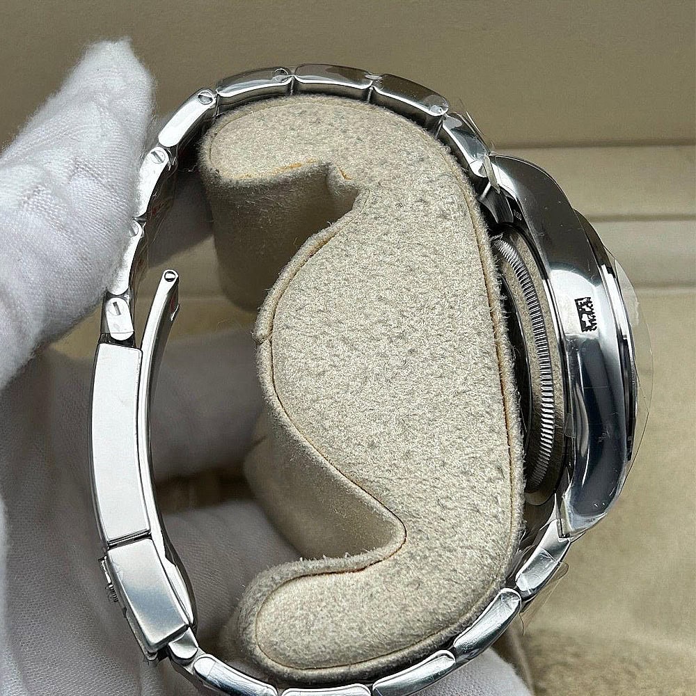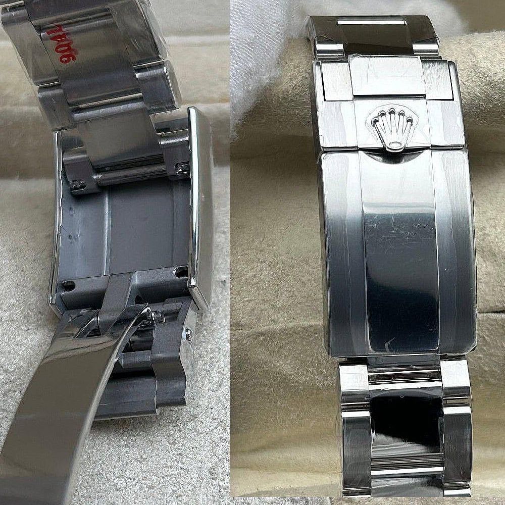 ベルト:高名なオイスターにデザインされたベルトが905プラチナ加工が施された904Lステンレススチールを採用し、DLCスクラッチプロティングコーティングを施されており、しっかりとしたネジも備えています。5ミリをコンフォートエクステンションリンク(イージリンクとも言う)を備えた折りたたみ式オイスターロック安全クラスプもより快適な付け心地をもたらします。