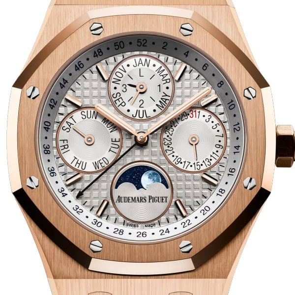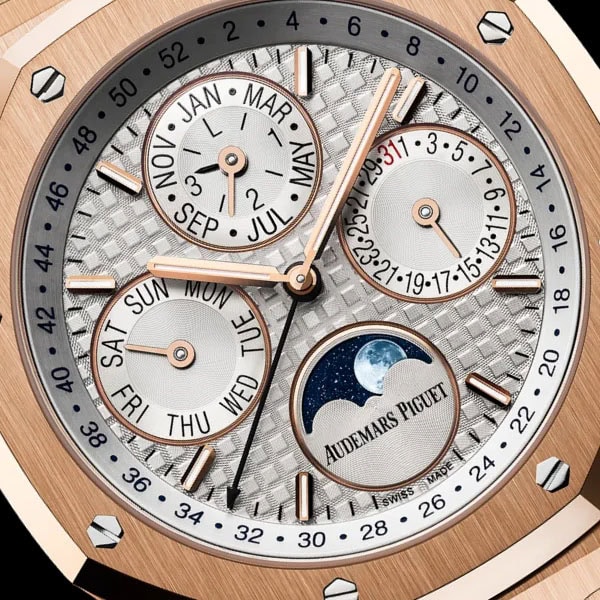 蓄光処理が施されたピンクゴールドのアプライドアワーマーカーとロイヤル オーク針が配されています。
