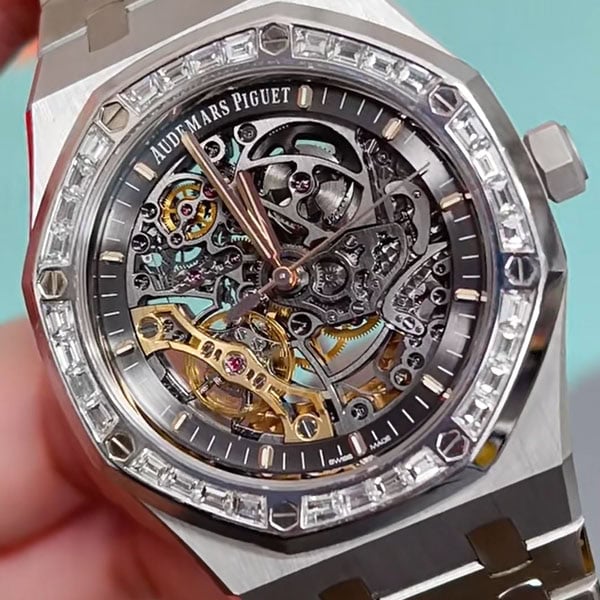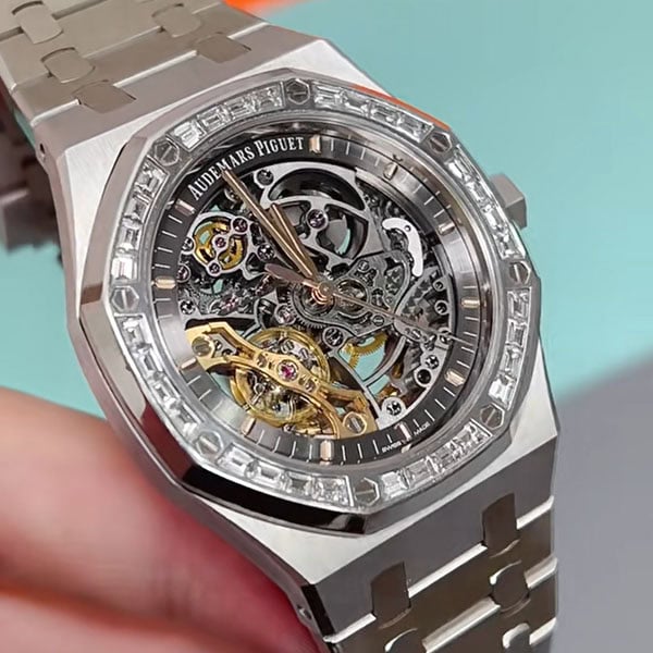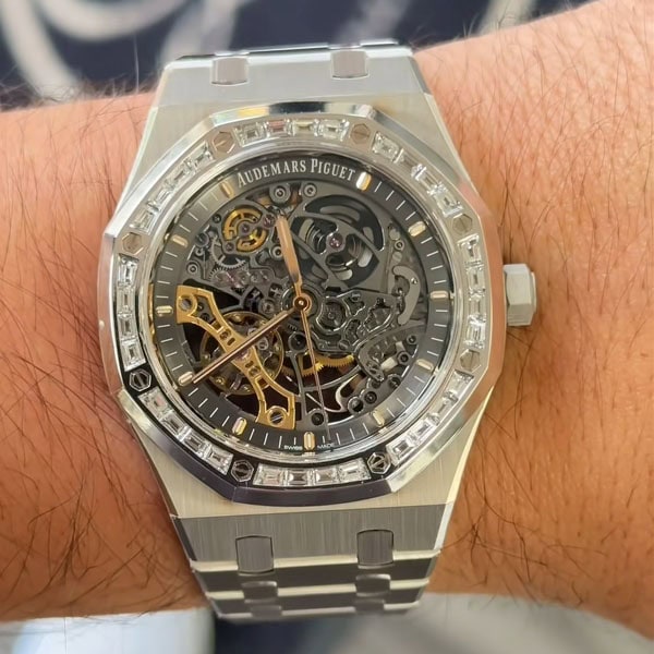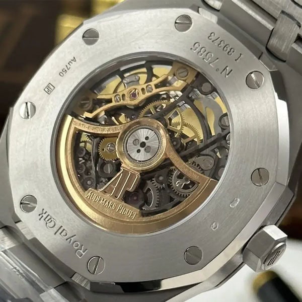 蓄光処理を施したピンクゴールド製のアプライドアワーマーカーとロイヤルオーク針が採用されています。