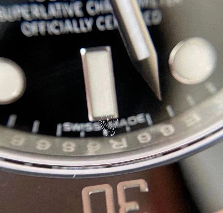 6時の位置にある小さいレーザー王冠透かしは時計の本物らしさを高めています。