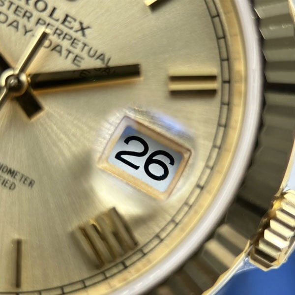 正しいデイトフォントとサイズを採用しており、アワーマーカーと針に施された18Kイエローゴールドコーティングは色落ちを防ぐできるのみならず、