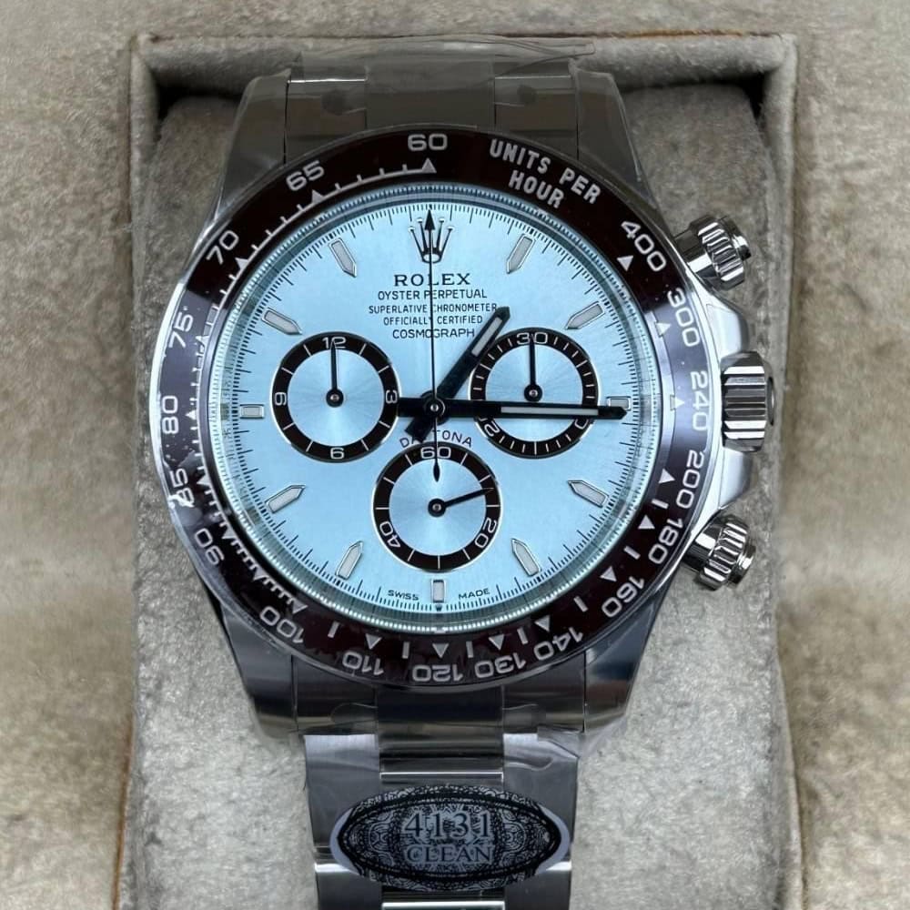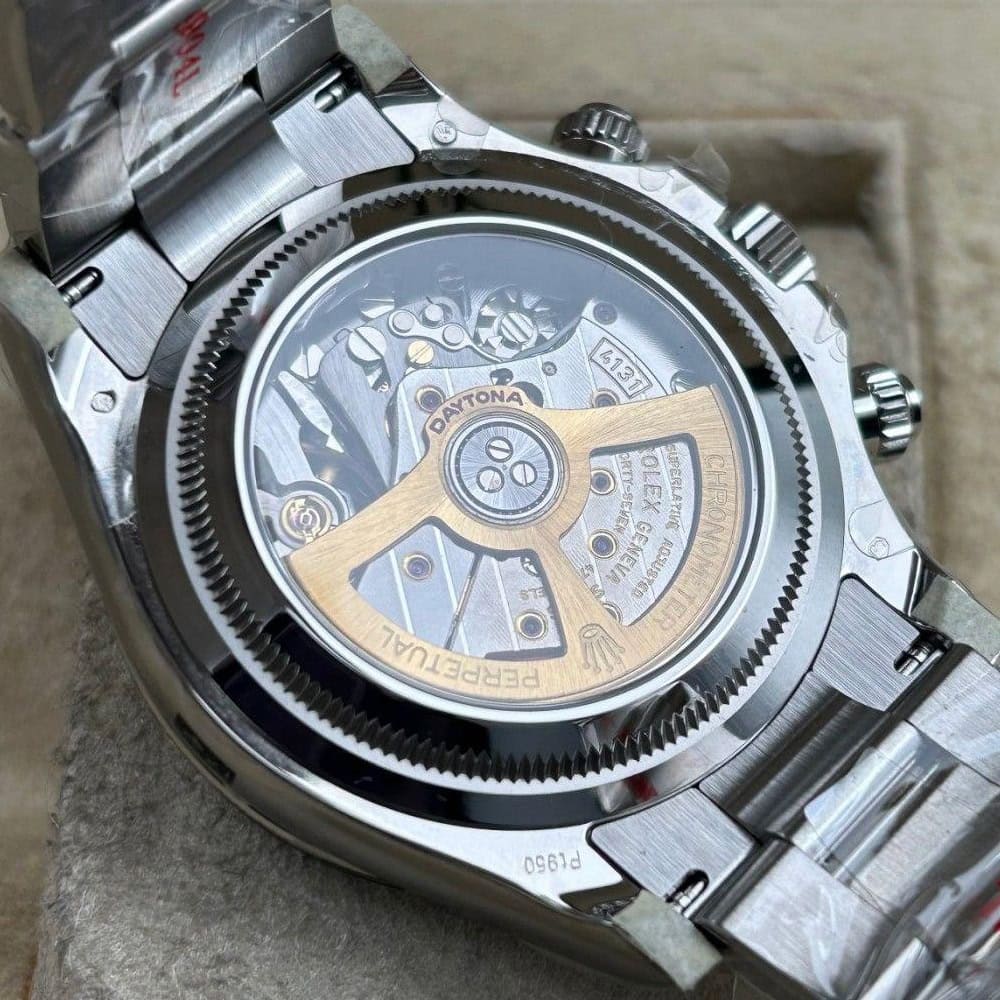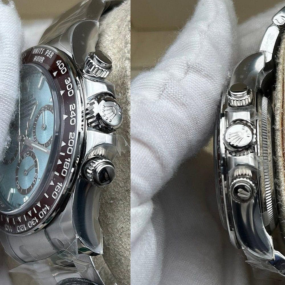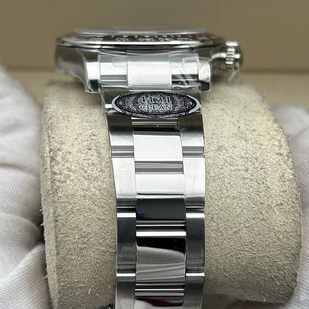 ケース:ケースはクリーンファクトリーのイノベーティブ・チームによってリニューアルされており、ラグとケースサイドによる光の反射によってその輪郭を際立てられています。本物のプラチナ加工が施された904L ステンレススチールで作り出されたケースは本物のロレックス専用プラチナ オイスターに最も近いものです。チェスナット ブラウンのモノブロック セラクロム ベゼルにはタキメーター目盛りを刻まれており、リフレクターリングにはシリアルナンバーを刻まれており、耐傷性あるサファイアガラスを採用しています。ねじ込み式ケースバック、プッシュボタン、巻き上げリューズを備えており、全て合成ラバーで密封されており、防水性を確保しています。Rehautリンクに刻まれたROLEXレーザー刻印は時計の本物らしさを高めており、施されたDLCスクラッチプロティングコーティングは時計の長持ちの耐久性を確保しています。