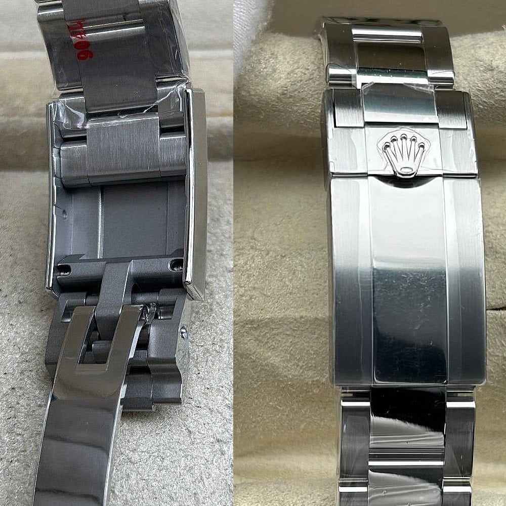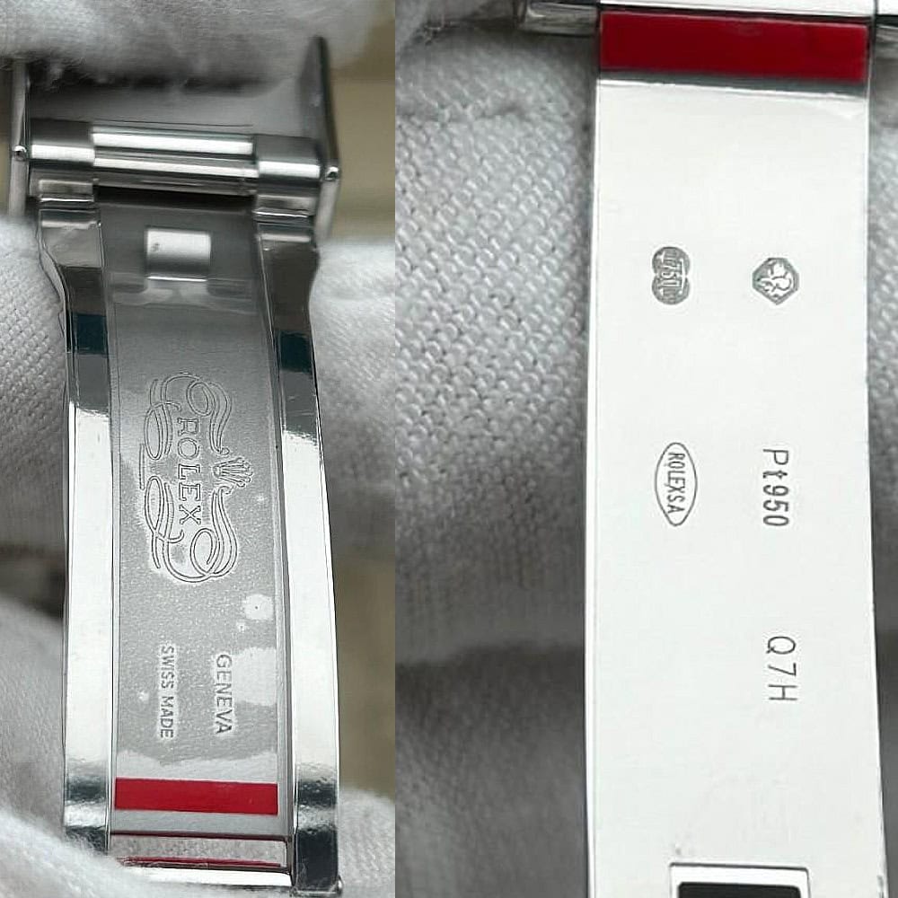 ベルト:高名なオイスターにデザインされたベルトが905プラチナ加工が施された904Lステンレススチールを採用し、DLCスクラッチプロティングコーティングを施されており、しっかりとしたネジも備えています。5ミリをコンフォートエクステンションリンク(イージリンクとも言う)を備えた折りたたみ式オイスターロック安全クラスプもより快適な付け心地をもたらします。