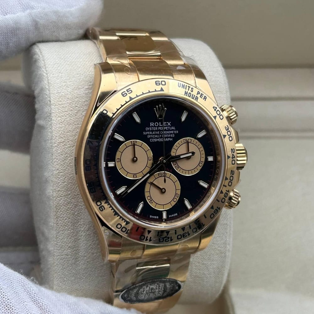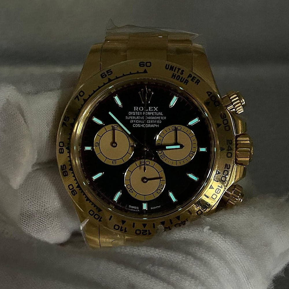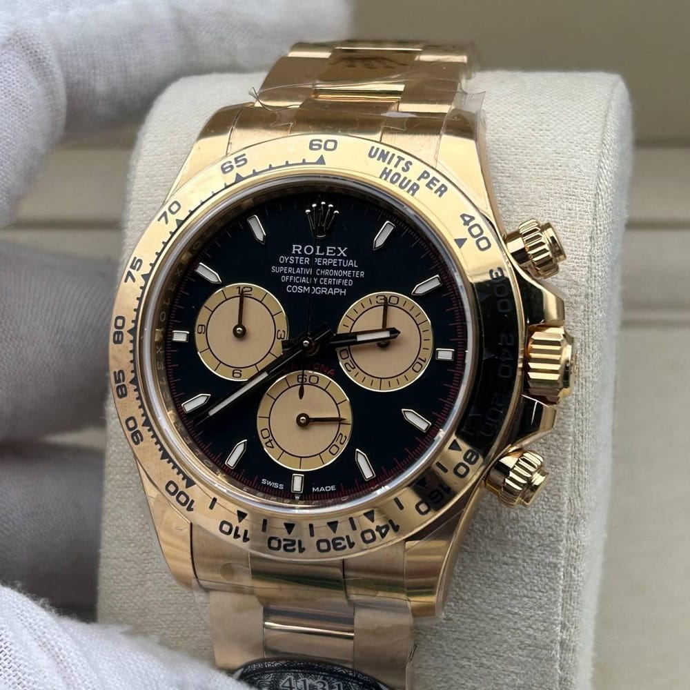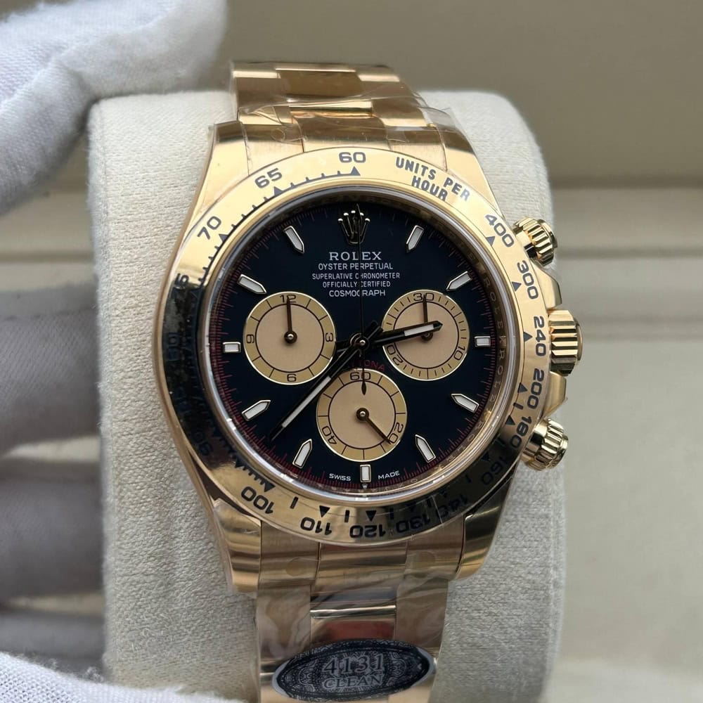ケース:クリンファクトリーによるこのデイトナは本物18KイエローゴールドPVDコーティング加工された頑丈な904Lステンレススチールによって作りされております。40ミリのケースは完璧に正規品と一致しております。ケースは一体鍛造製法によって作り出されており、滑らかで洗練されたエッジが特徴です。頑丈なねじ込み式リューズはスイス製ラバー・シールと完璧に組み合わされております。RehautにはROLEXROLEXの刻印が刻まれており、あらゆる方面はロレックスデザインを一致しております。