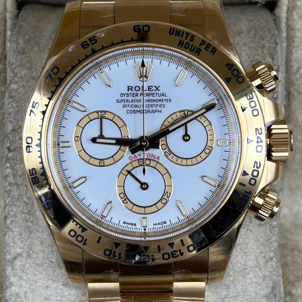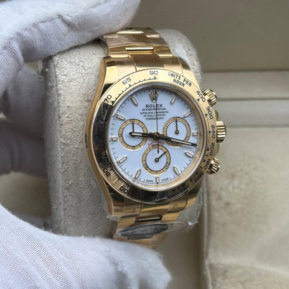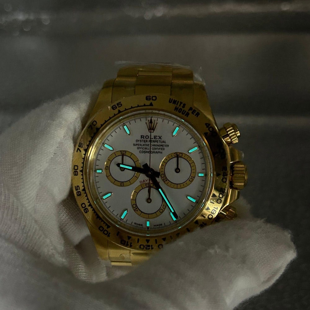 文字盤:この時計はスティックマーカーが付いたホワイト文字盤を誇っています。アワーマーカーと針はスーパールミノバブルールミネッセンス蓄光塗料でコーティングされており、夜間に9時間まで均一に明るく発光できます。これにより、ロレックス正規品と同じく、レーザーによる高精度のテキスト、プリント、刻印と相まって、高い可読性が保証されています。更に、アワーマーカーと針には18kイエローゴールドコーティングを施されたため、色落としません。同時に、時計の高級感も高めています。