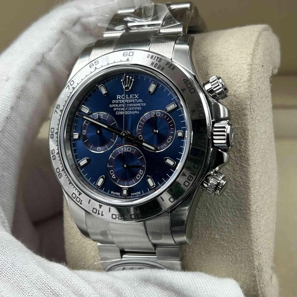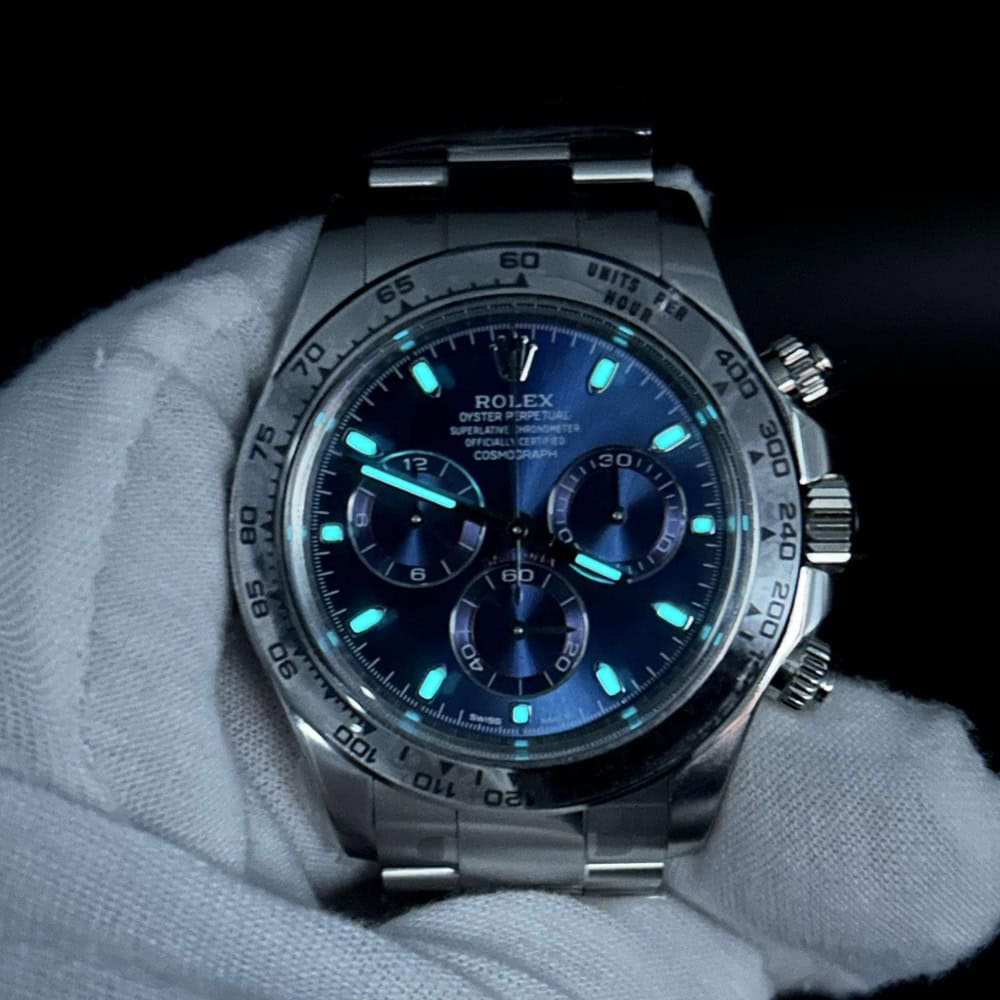 文字盤:この時計はスティックマーカーが付いたブルー文字盤を誇っています。アワーマーカーと針はスーパールミノバブルールミネッセンス蓄光塗料でコーティングされており、夜間に9時間まで均一に明るく発光できます。これにより、ロレックス正規品と同じく、レーザーによる高精度のテキスト、プリント、刻印と相まって、高い可読性が保証されています。更に、アワーマーカーと針には18kホワイトゴールドコーティングを施されたため、色落としません。同時に、時計の高級感も高めています。