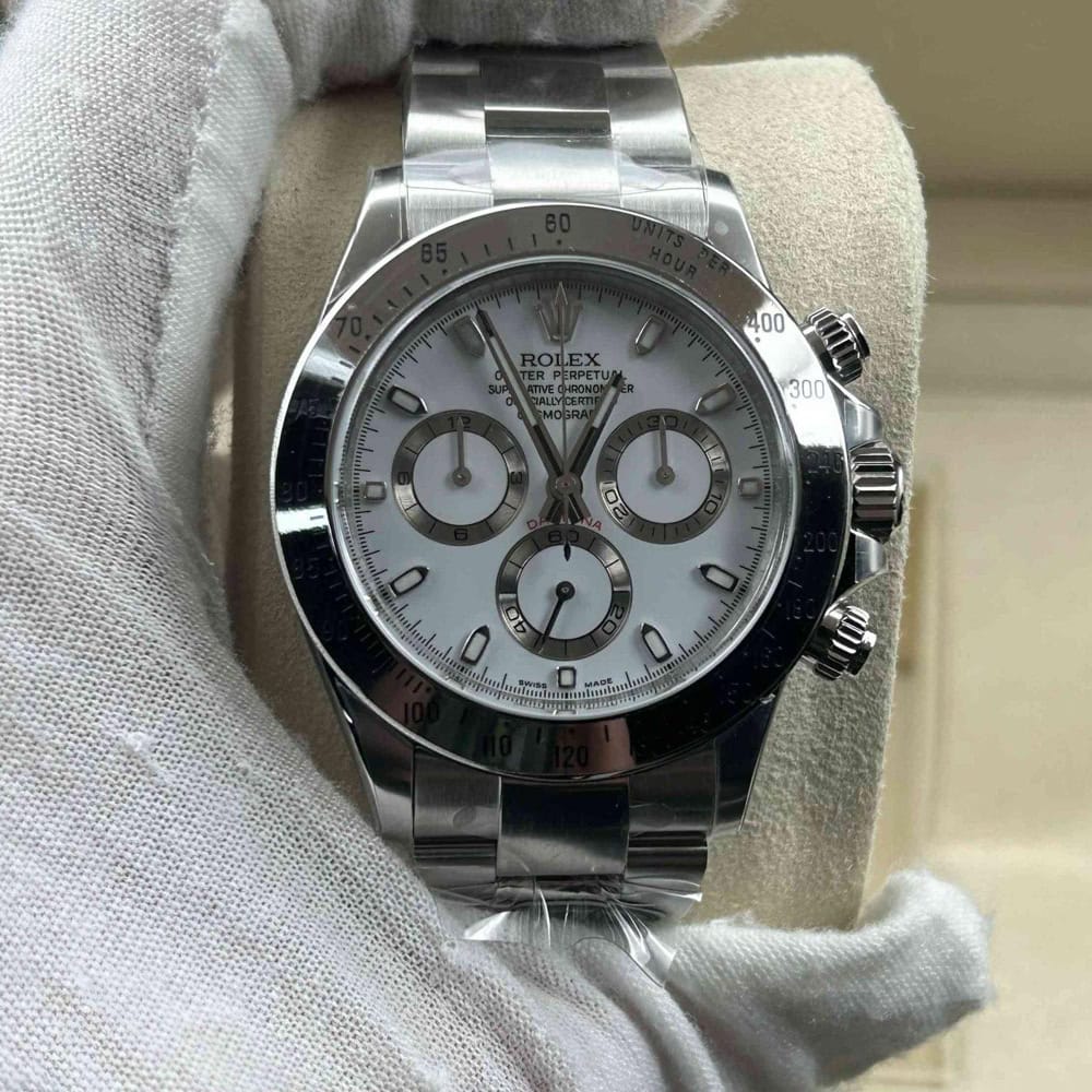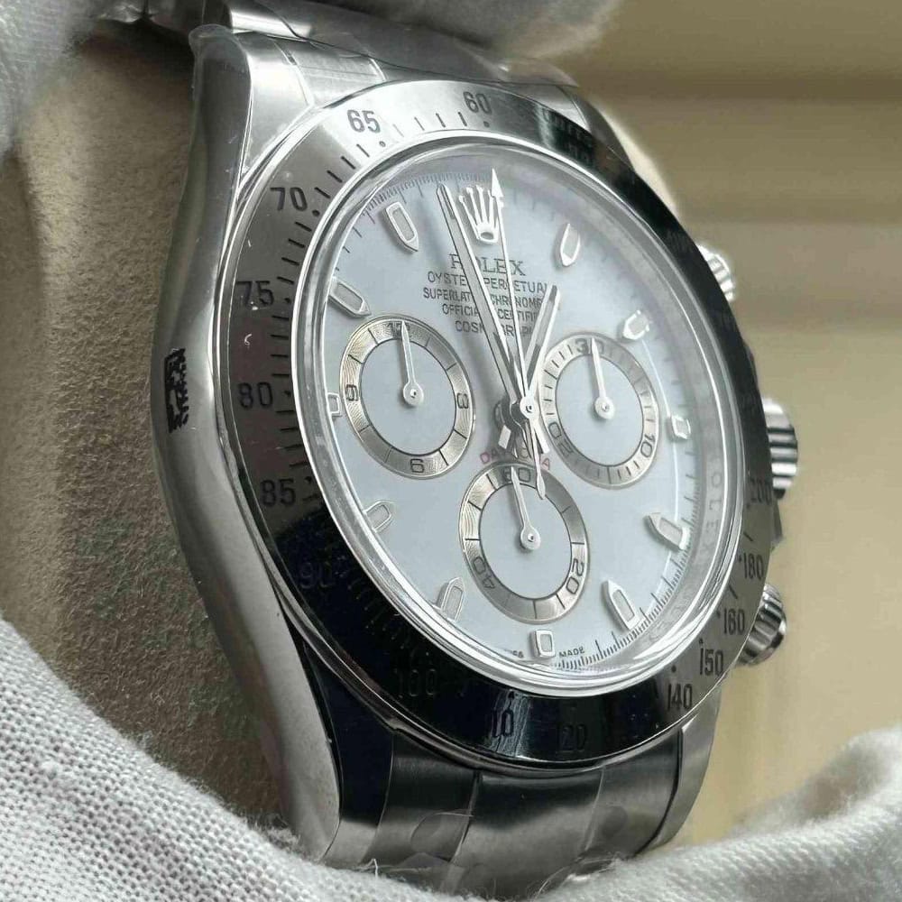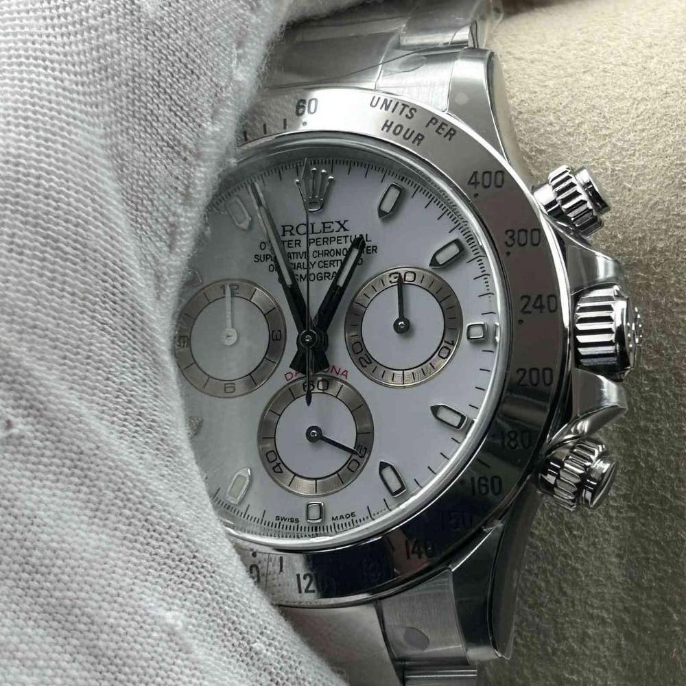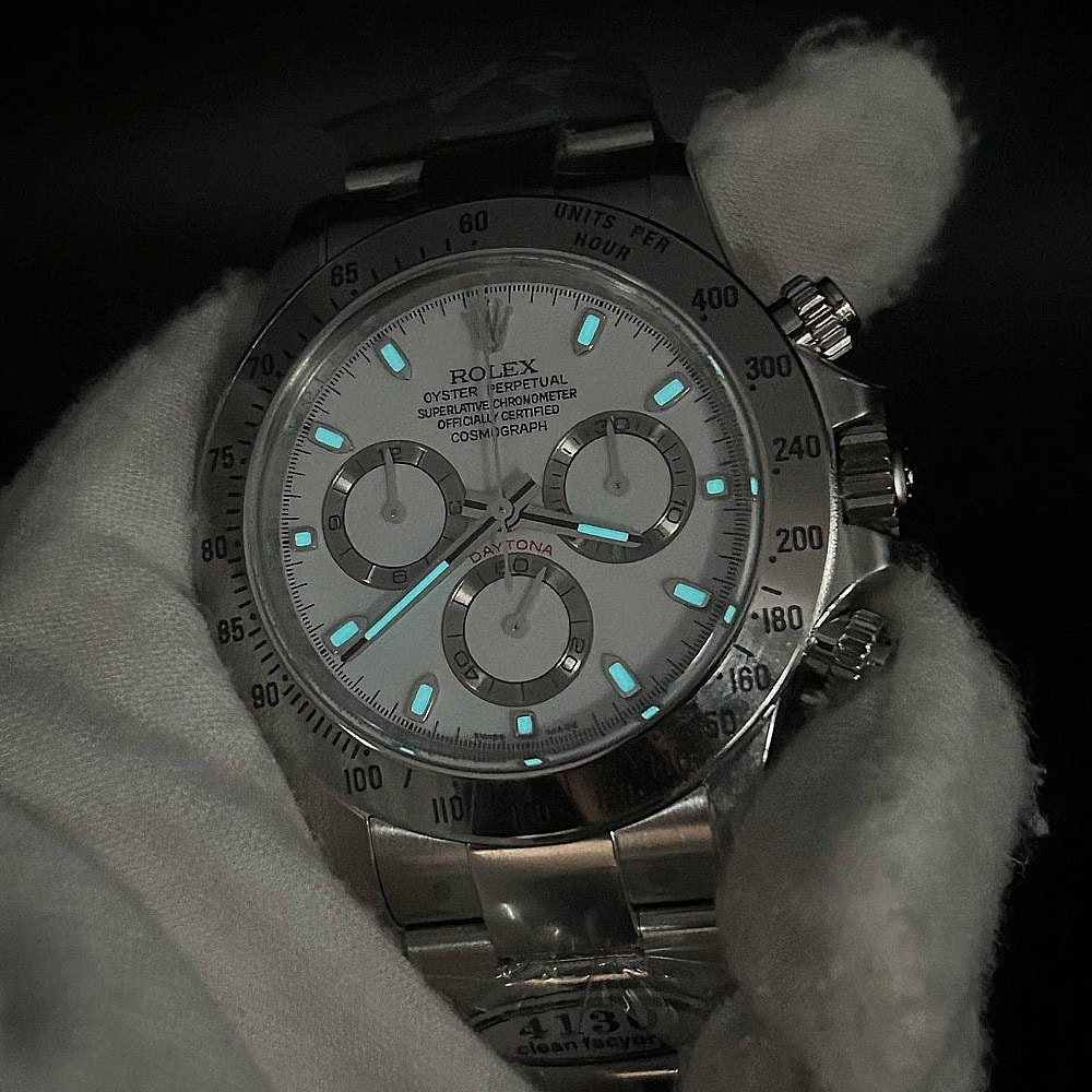 文字盤:この時計はスティックマーカーが付いたホワイト文字盤を誇っています。アワーマーカーと針はスーパールミノバブルールミネッセンス蓄光塗料でコーティングされており、夜間に9時間まで均一に明るく発光できます。これにより、ロレックス正規品と同じく、レーザーによる高精度のテキスト、プリント、刻印と相まって、高い可読性が保証されています。更に、アワーマーカーと針には18kホワイトゴールドコーティングを施されたため、色落としません。同時に、時計の高級感も高めています。