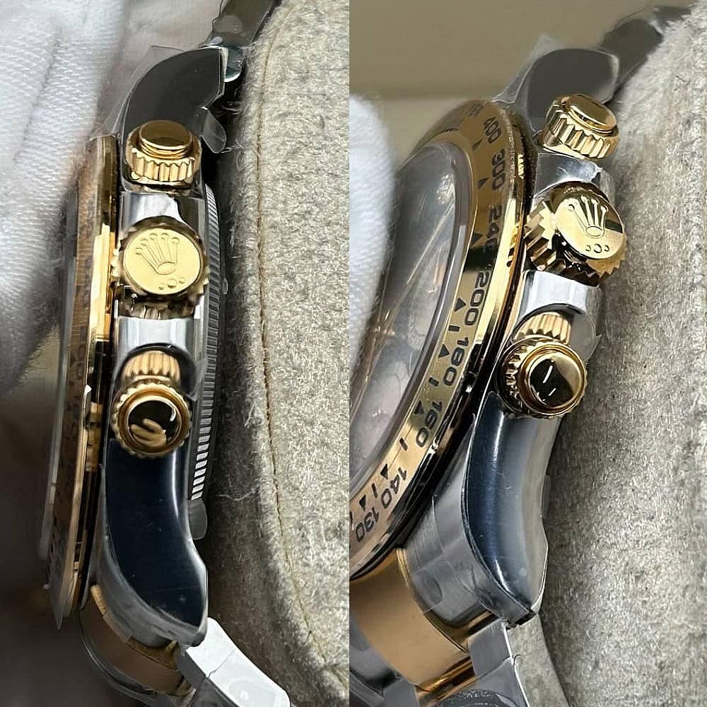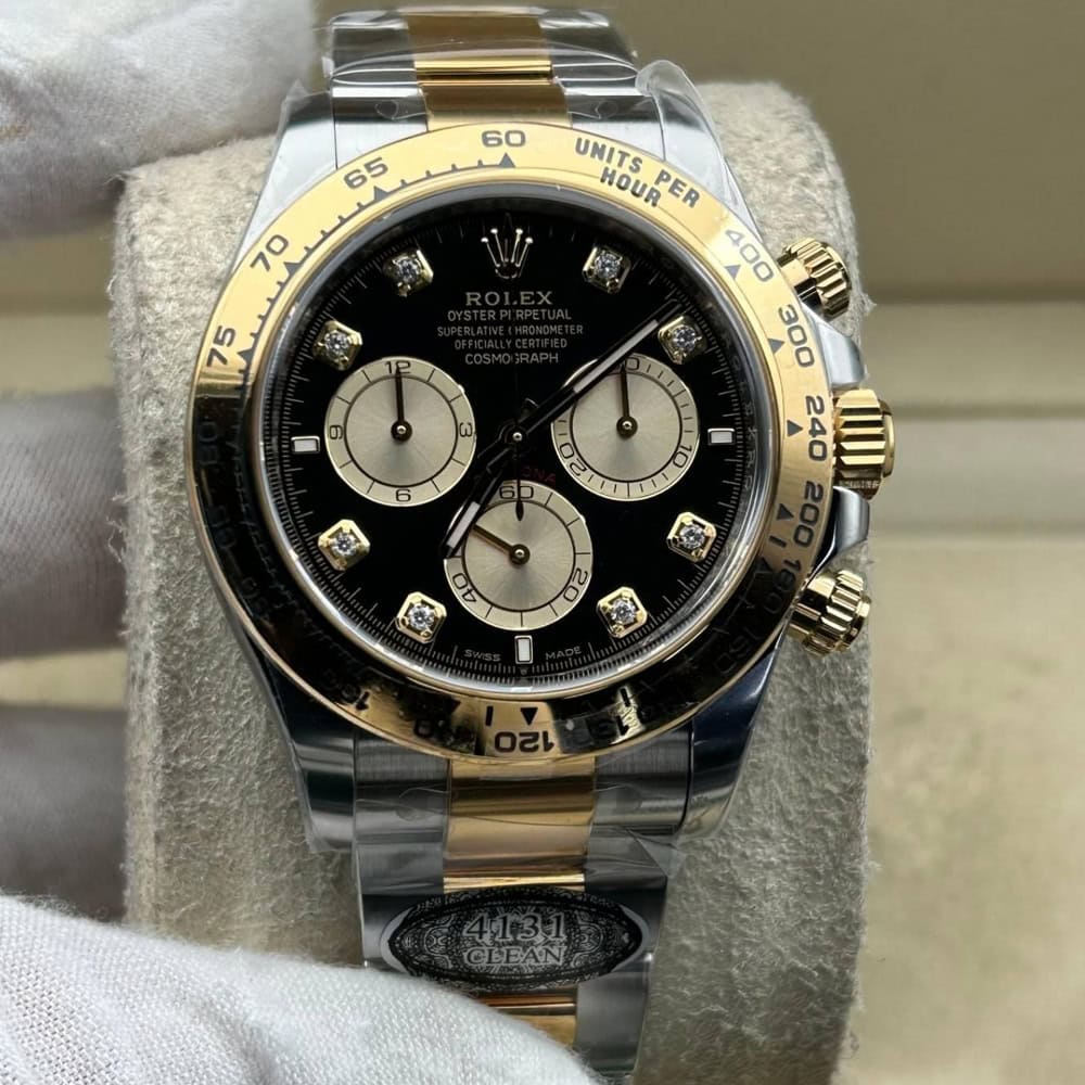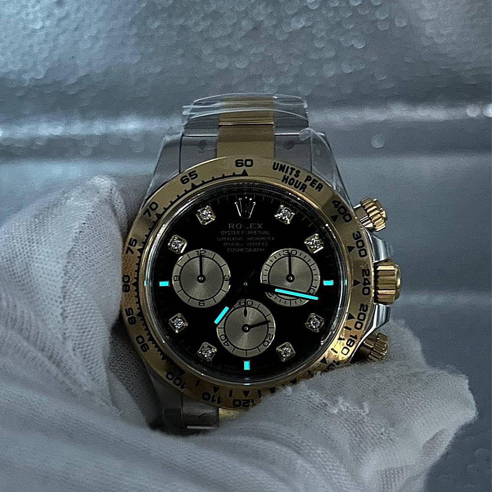 文字盤:文字盤は洗練された黒い背景にモアサナイトダイヤモンドのマーカーを配し、シャンパンカラーのクロノグラフサブダイヤルがアクセントとなっています。アワーマーカーと針はスーパールミノバブルールミネッセンス蓄光塗料でコーティングされており、夜間に9時間まで均一に明るく発光できます。 これにより、ロレックス正規品と同じく、レーザーによる高精度のテキスト、プリント、刻印と相まって、高い可読性が保証されています。 更に、アワーマーカーと針には18kイエローゴールドコーティングを施されたため、色落としません。 同時に、時計の高級感も高めています。