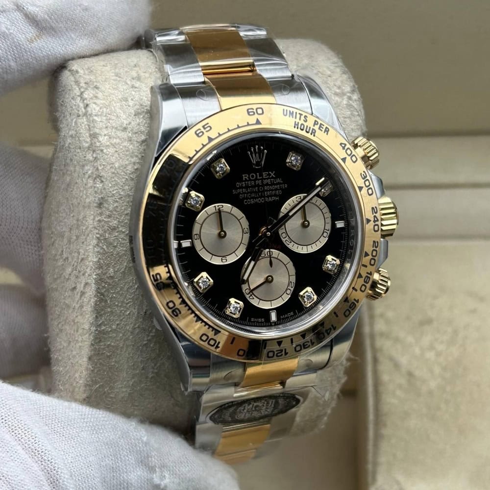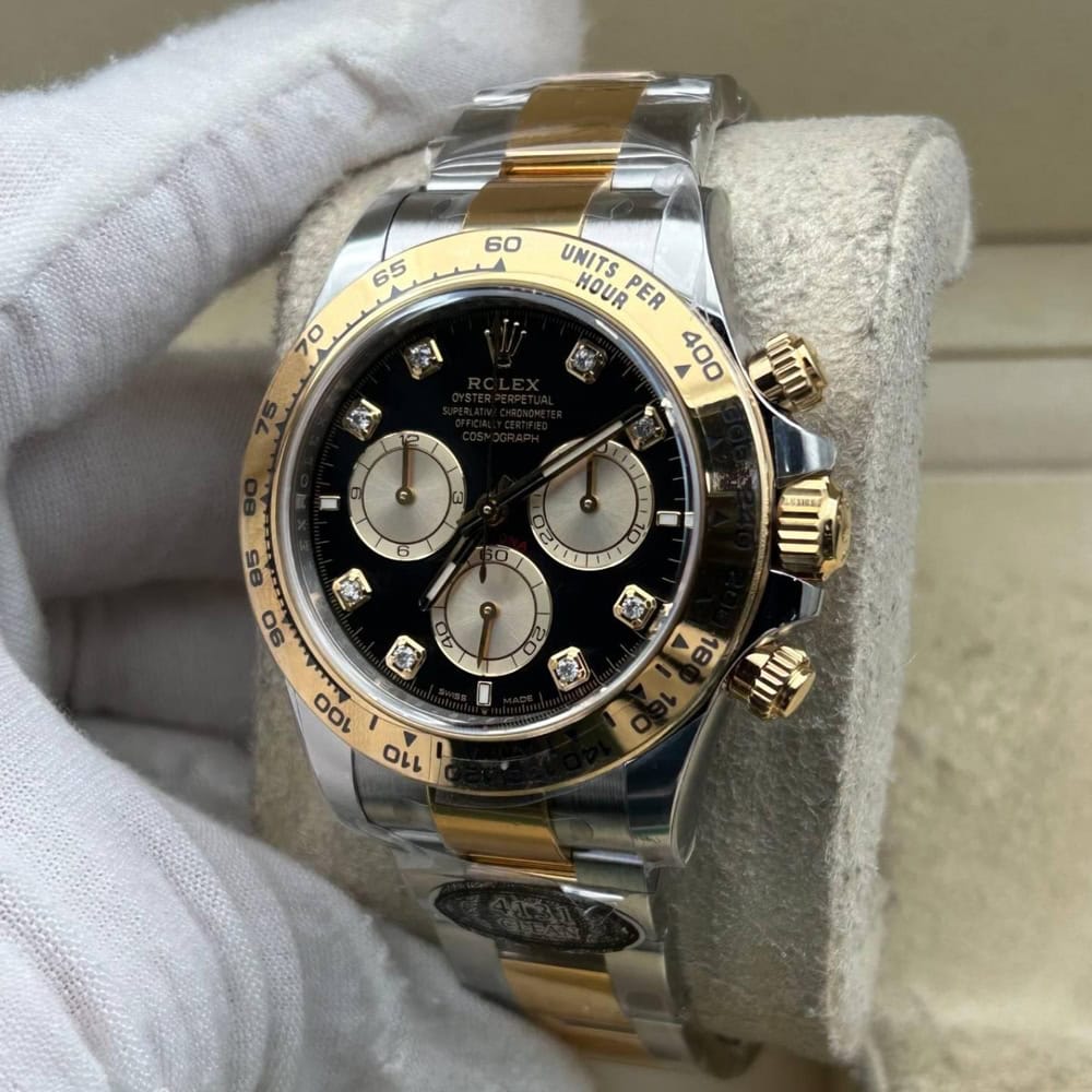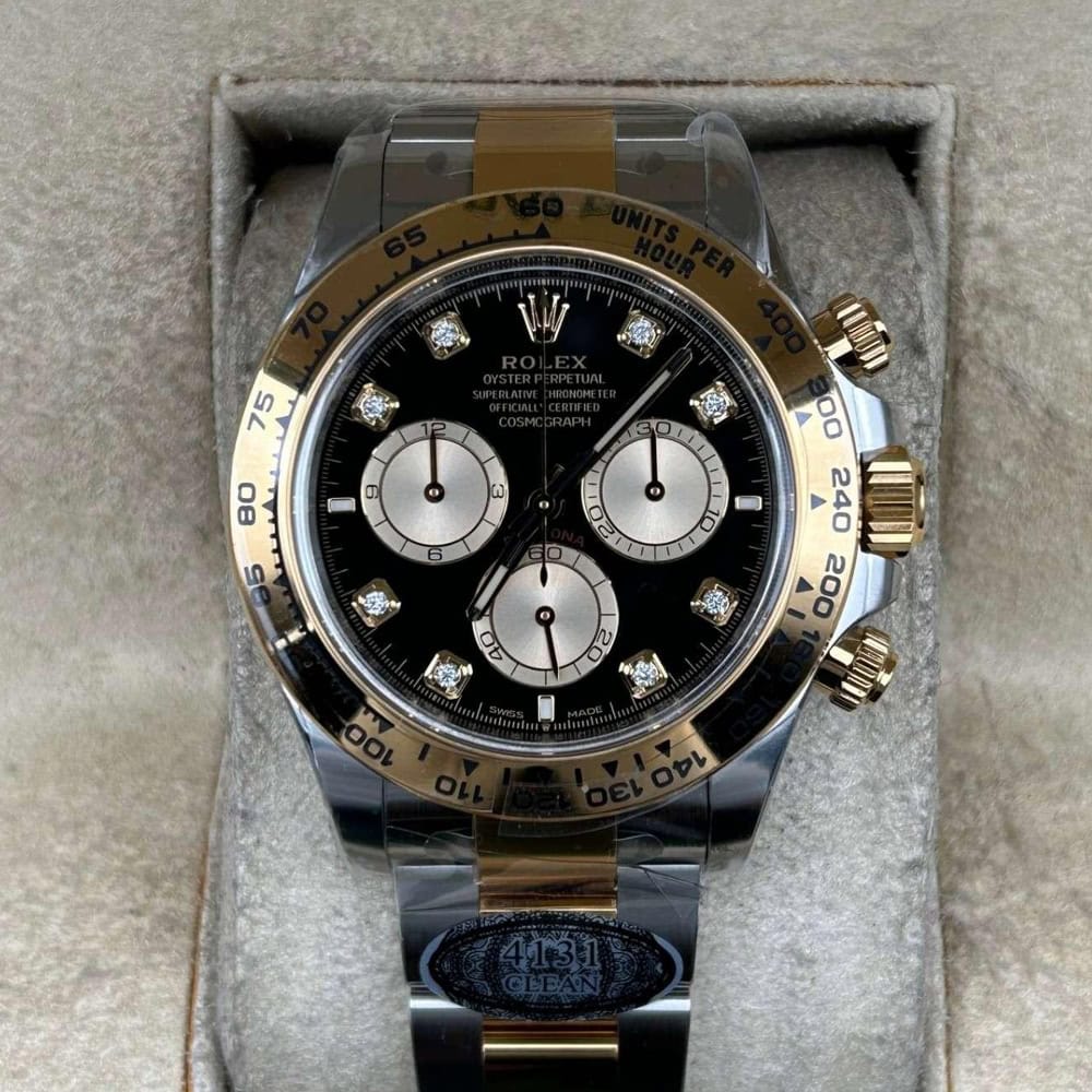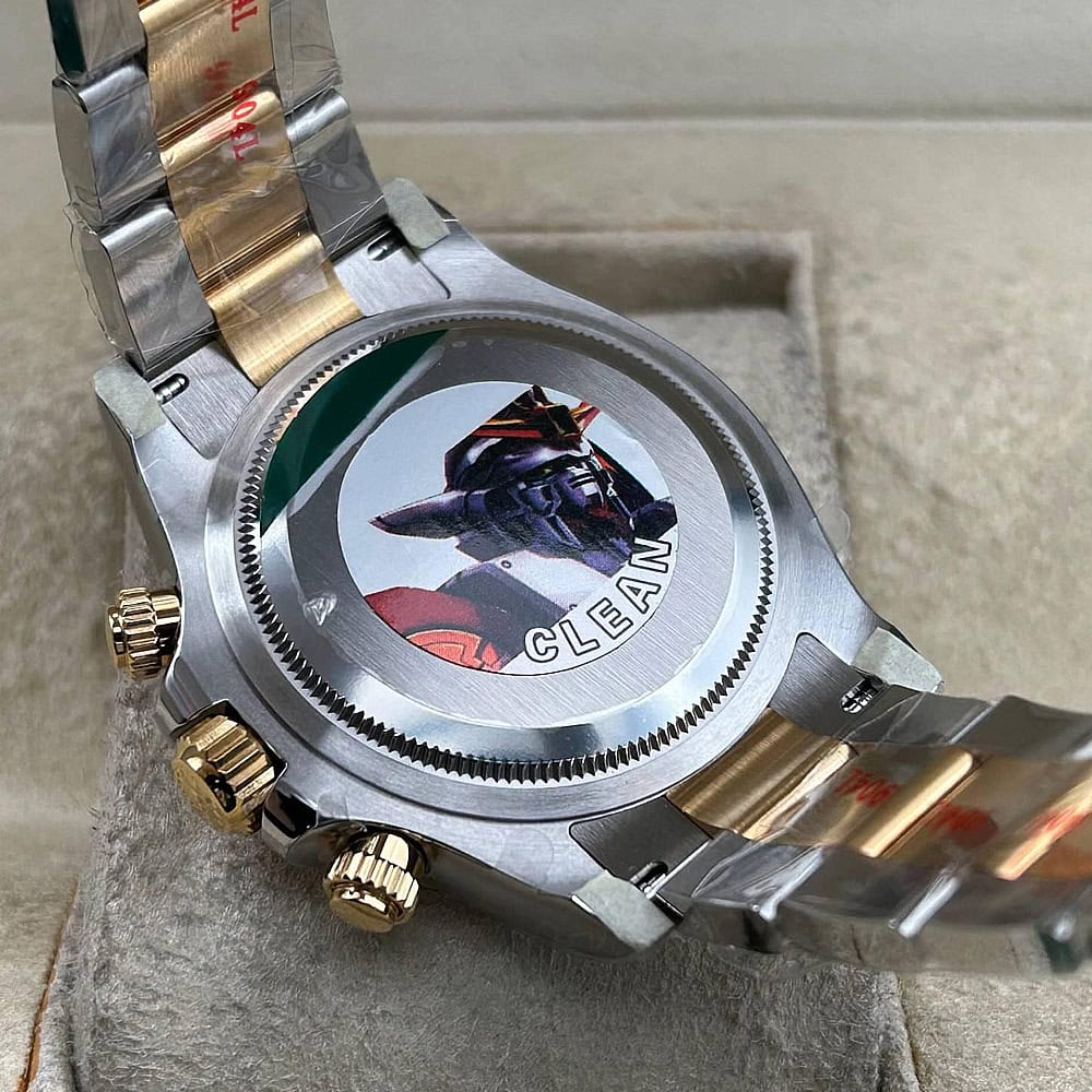 文字盤:文字盤は洗練された黒い背景にモアサナイトダイヤモンドのマーカーを配し、シャンパンカラーのクロノグラフサブダイヤルがアクセントとなっています。アワーマーカーと針はスーパールミノバブルールミネッセンス蓄光塗料でコーティングされており、夜間に9時間まで均一に明るく発光できます。 これにより、ロレックス正規品と同じく、レーザーによる高精度のテキスト、プリント、刻印と相まって、高い可読性が保証されています。 更に、アワーマーカーと針には18kイエローゴールドコーティングを施されたため、色落としません。 同時に、時計の高級感も高めています。