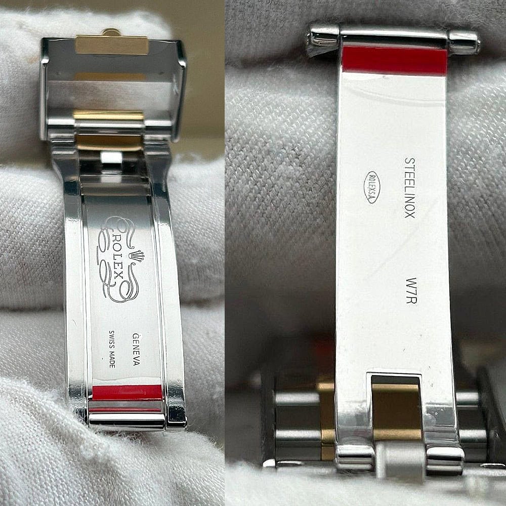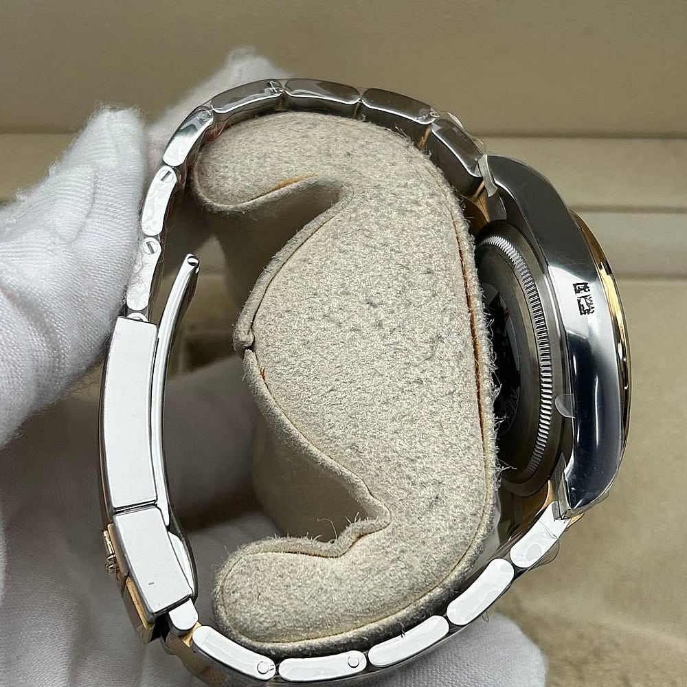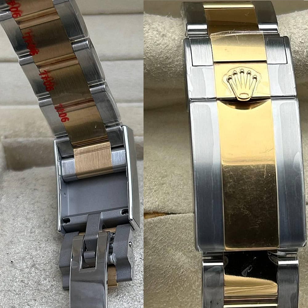 ベルト:ベルトは平たい3ピースリンクを象徴とするクラシックなオイスターデザインを採用されており、18Kイエローゴールドコーティングされた904Lステンレススチールで作り出されており、DLCスクラッチプロティングコーティングも施されています。ベルトはしっかりとしたネジ山と5 mm コンフォート エクステンション リンク(イージリンクとも言う)を備えた折りたたみ式オイスターロック安全クラスプを含まれています。