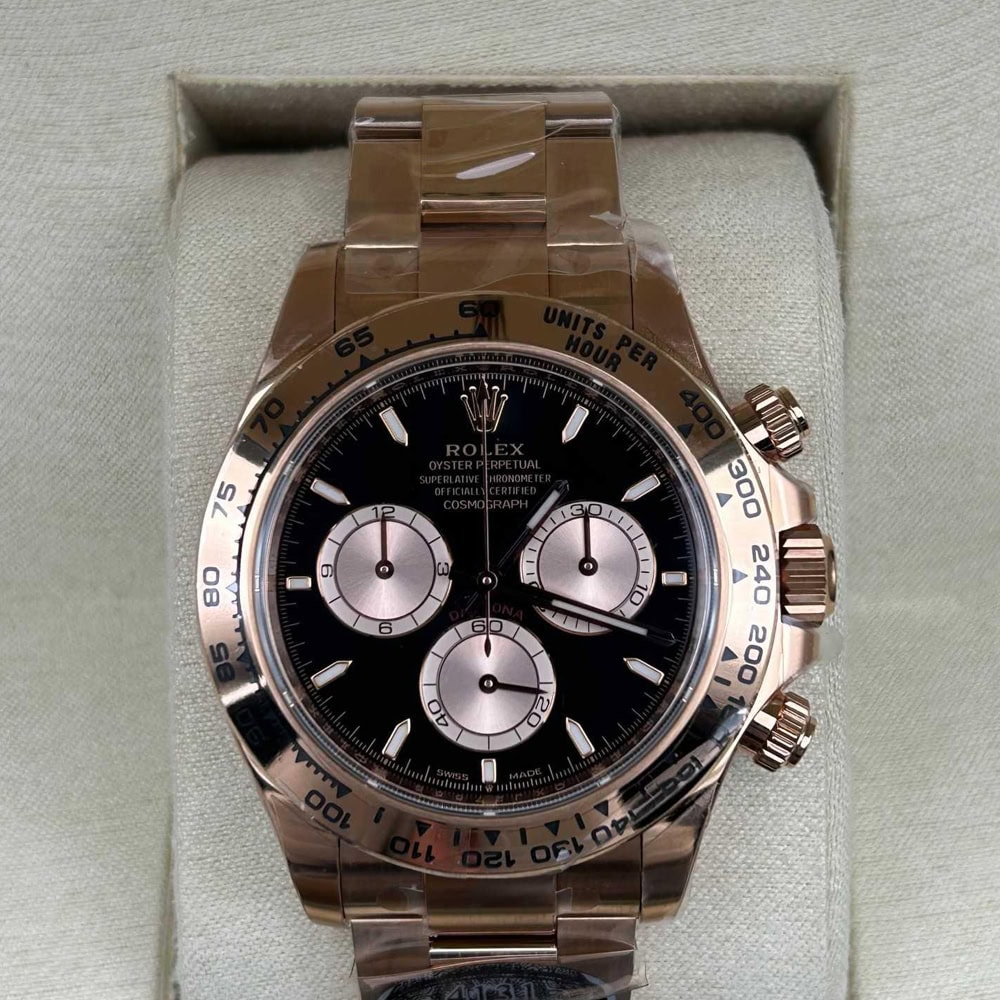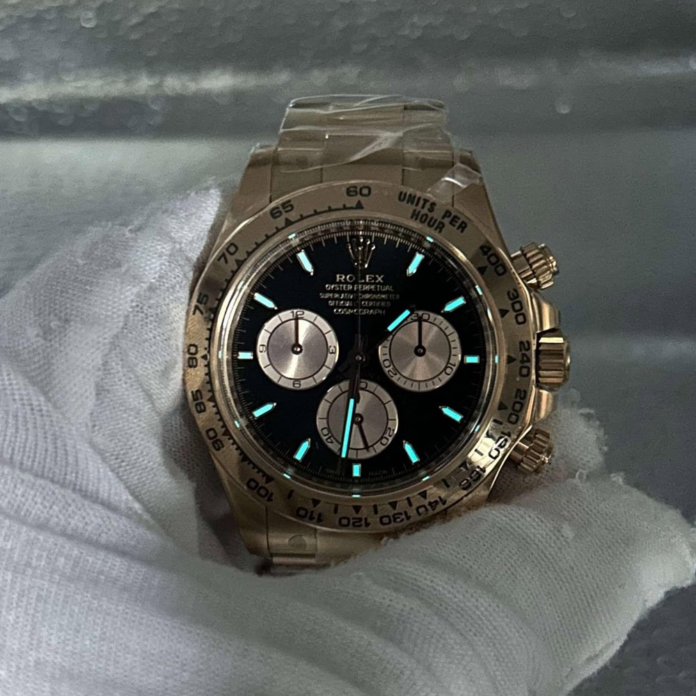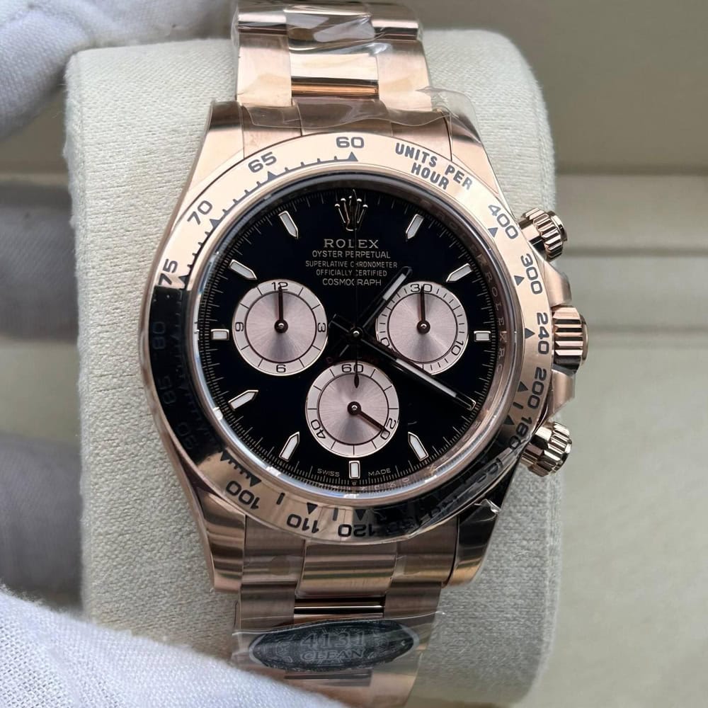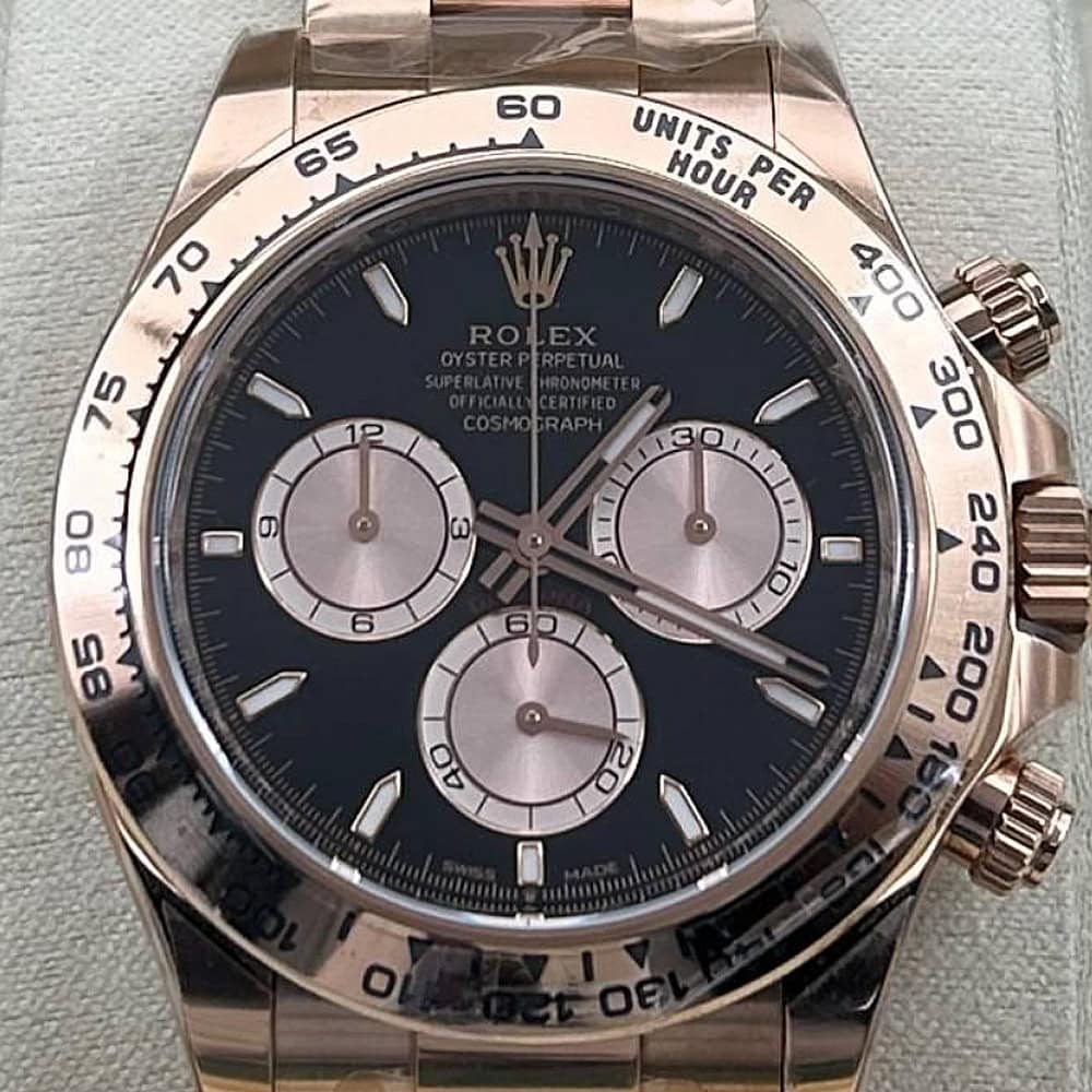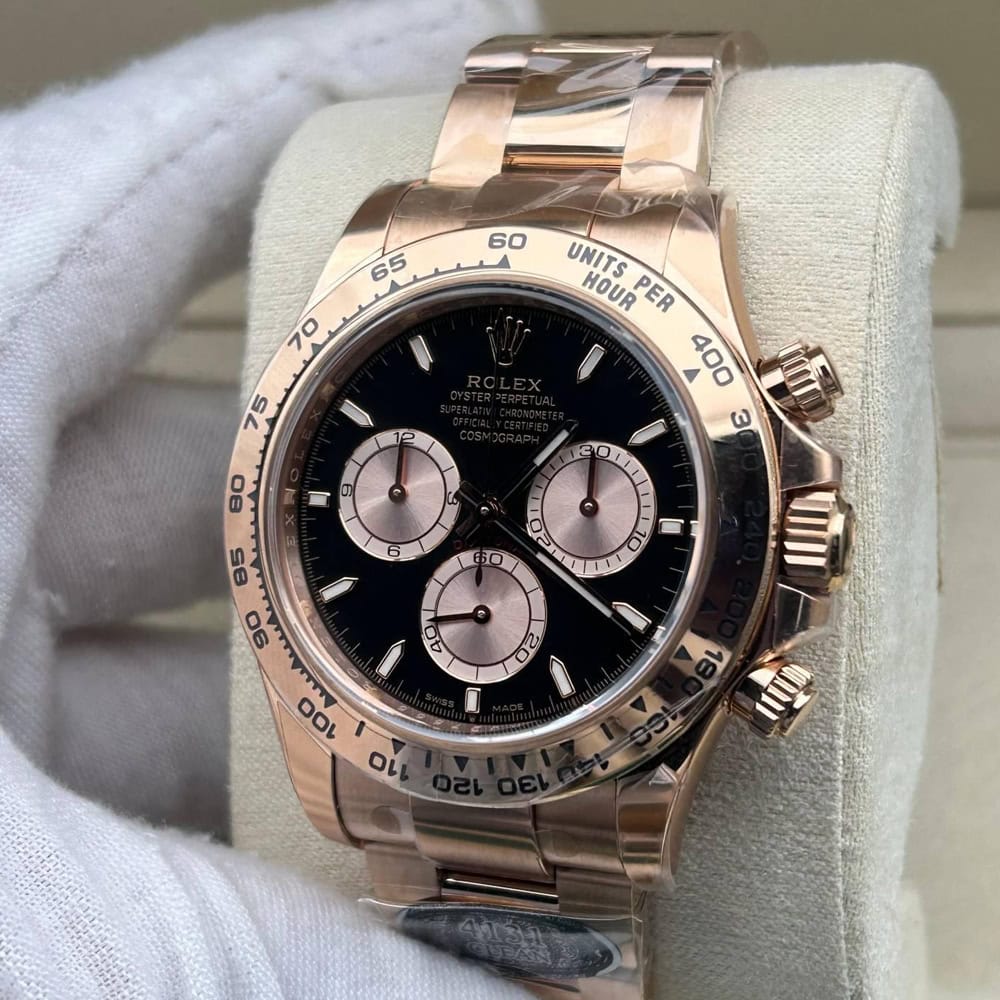 文字盤:ブラック文字盤とローズゴールドサブダイヤル、スティックマーカーと相まって、この時計のエレガンスさを表しております。 アワーマーカーと針にはスーパールミノバブルー蓄光コーティングされており、夜闇に9時間ぐらい視認性を確保できます。 クリーンファクトリーはあらゆるレーザーテキスト、プリント、刻印の精度がロレックス正規品と見分けがつけないことを確保しております。 アワーマーカーと針に施された18Kローズゴールドコーティングは時計の高級感を高めながら、色褪せすることを防止しております。