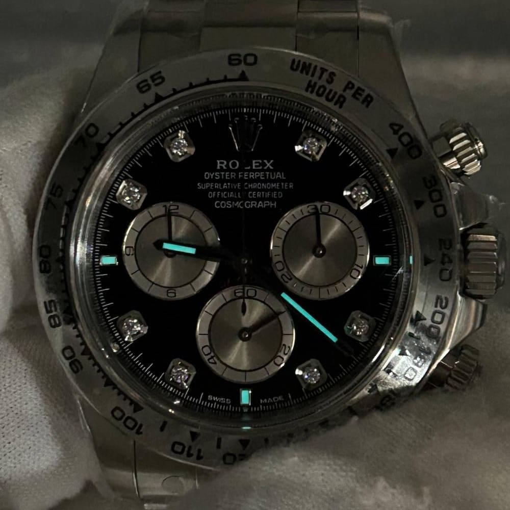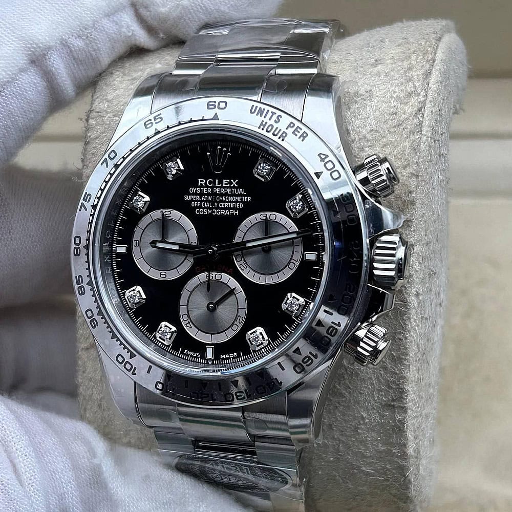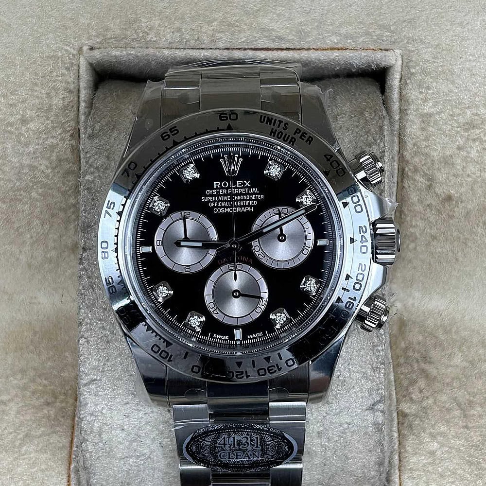 文字盤:文字盤は洗練された黒い背景にモアサナイトダイヤモンドのマーカーを配し、ホワイトゴールドのクロノグラフサブダイヤルがアクセントとなっています。アワーマーカーと針はスーパールミノバブルールミネッセンス蓄光塗料でコーティングされており、夜間に9時間まで均一に明るく発光できます。 これにより、ロレックス正規品と同じく、レーザーによる高精度のテキスト、プリント、刻印と相まって、高い可読性が保証されています。 更に、アワーマーカーと針には18kホワイトゴールドコーティングを施されたため、色落としません。 同時に、時計の高級感も高めています。