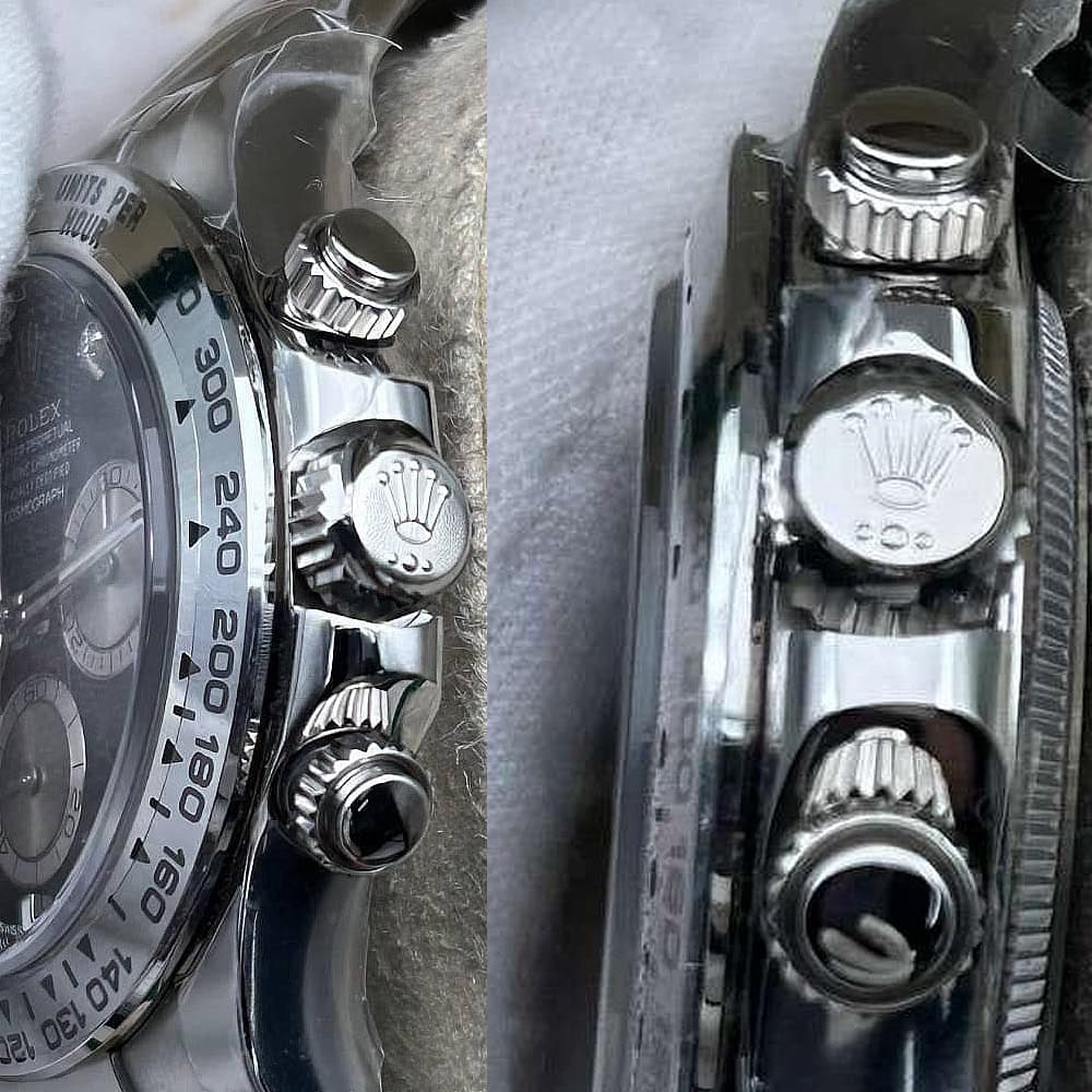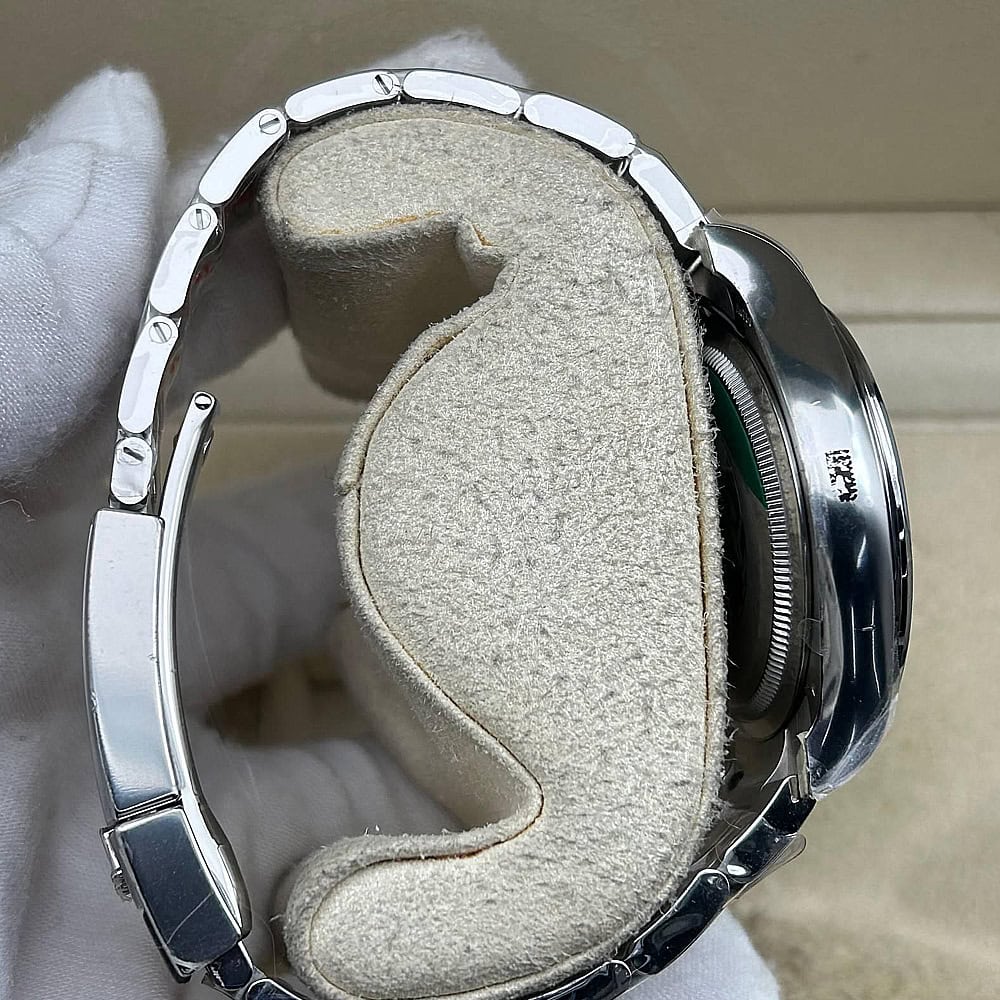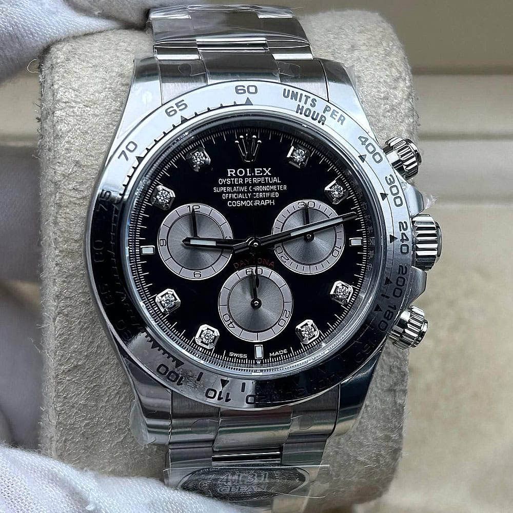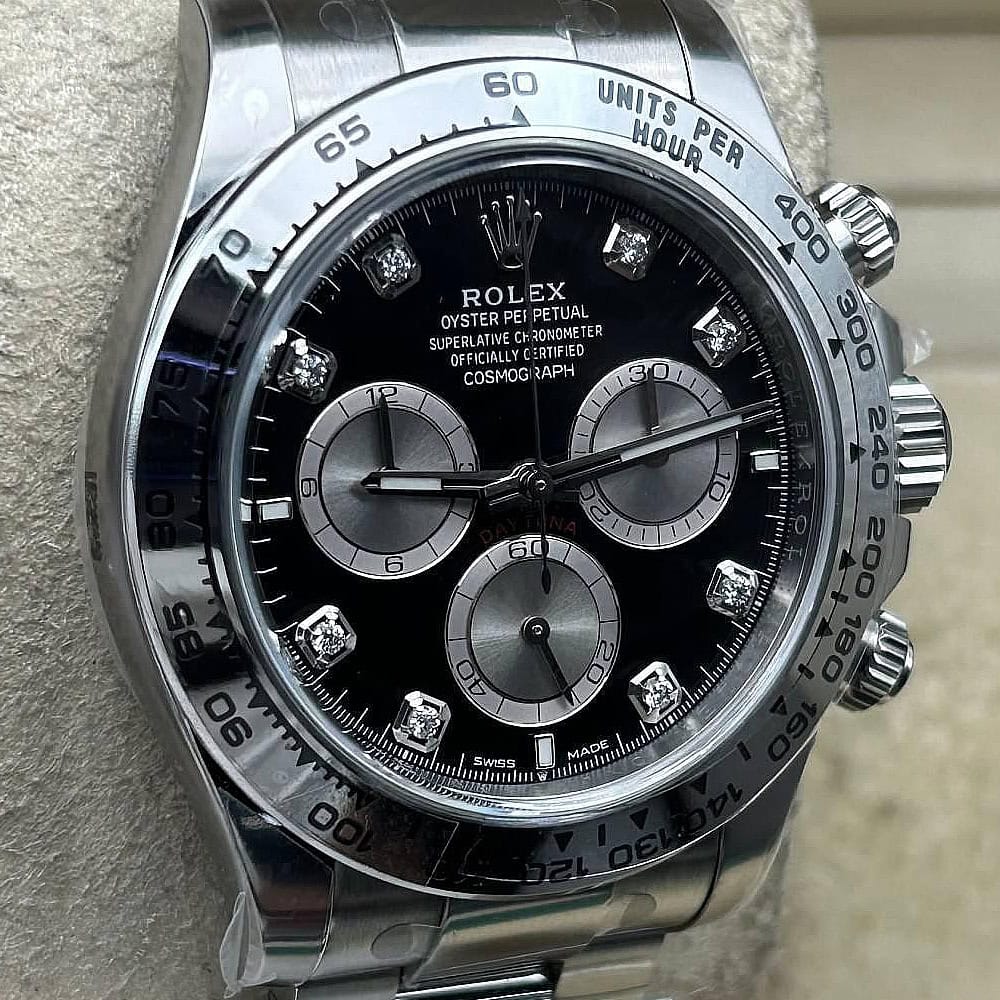 文字盤:文字盤は洗練された黒い背景にモアサナイトダイヤモンドのマーカーを配し、ホワイトゴールドのクロノグラフサブダイヤルがアクセントとなっています。アワーマーカーと針はスーパールミノバブルールミネッセンス蓄光塗料でコーティングされており、夜間に9時間まで均一に明るく発光できます。 これにより、ロレックス正規品と同じく、レーザーによる高精度のテキスト、プリント、刻印と相まって、高い可読性が保証されています。 更に、アワーマーカーと針には18kホワイトゴールドコーティングを施されたため、色落としません。 同時に、時計の高級感も高めています。
