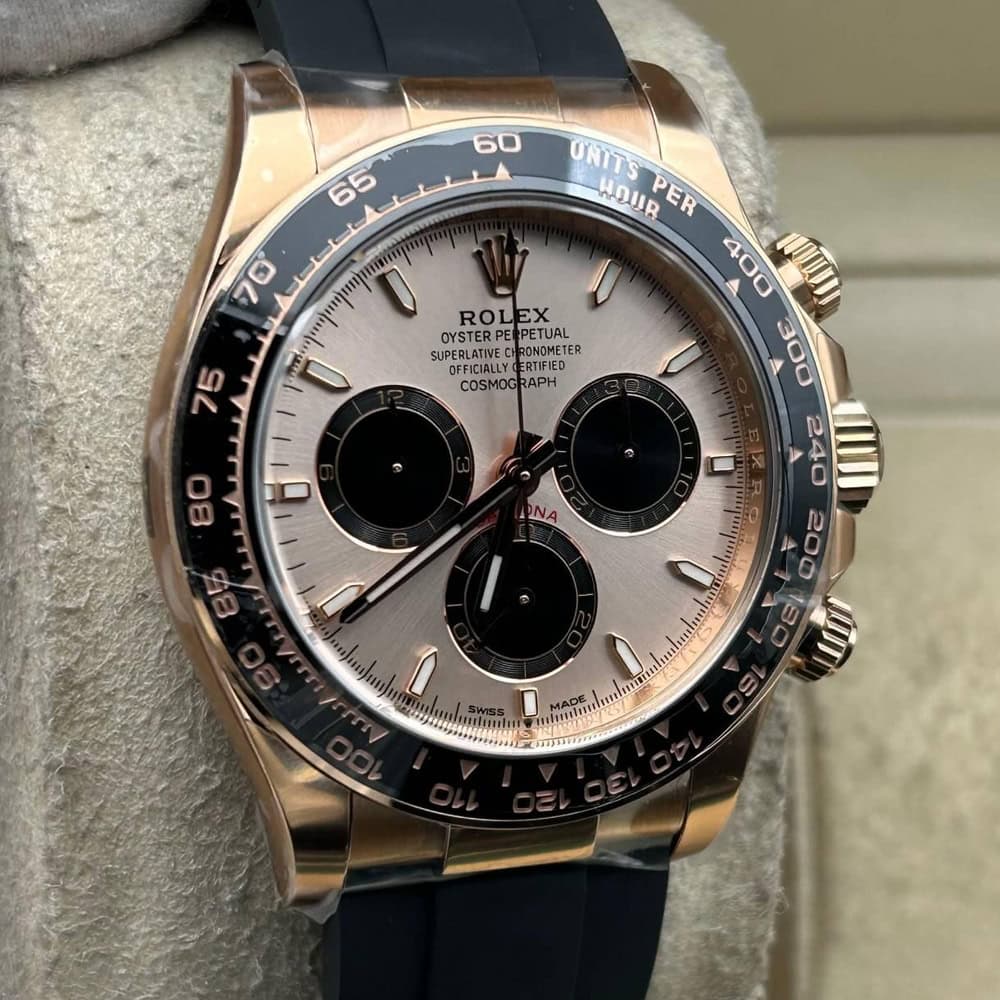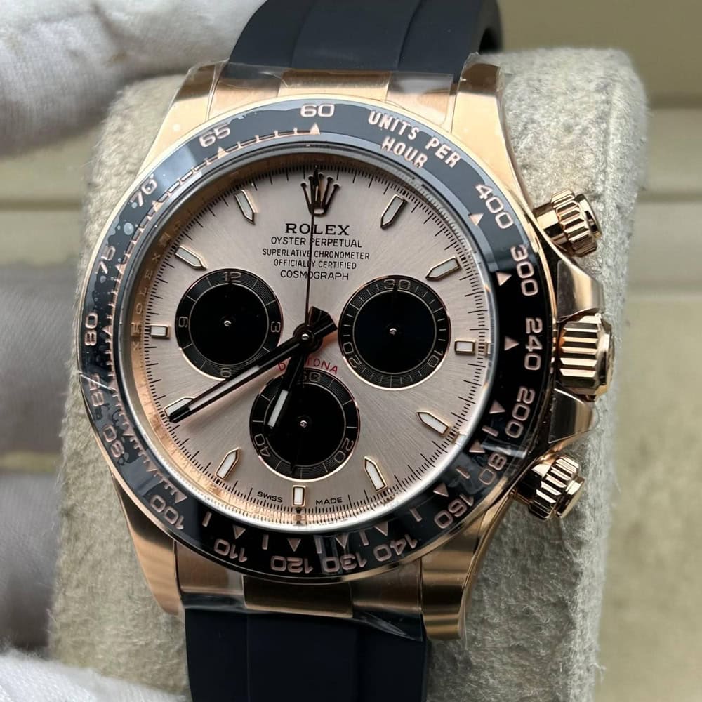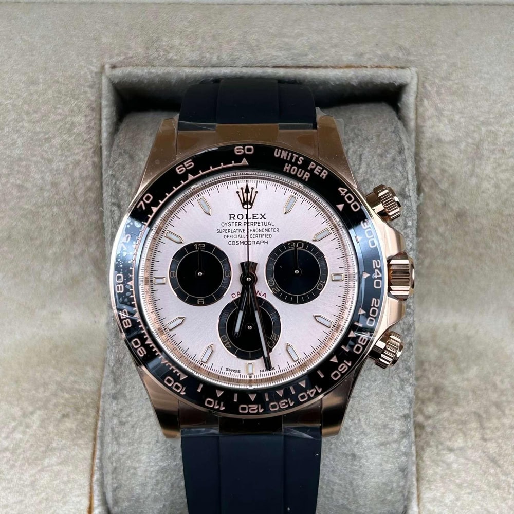 ケース:クリンファクトリーによるこのデイトナは本物18KローズゴールドPVDコーティング加工された頑丈な904Lステンレススチールによって作りされております。40ミリのケースは完璧に正規品と一致しております。ケースは一体鍛造製法によって作り出されており、滑らかで洗練されたエッジが特徴です。頑丈なねじ込み式リューズはスイス製ラバー・シールと完璧に組み合わされております。RehautにはROLEXROLEXの刻印が刻まれており、あらゆる方面はロレックスデザインを一致しております。