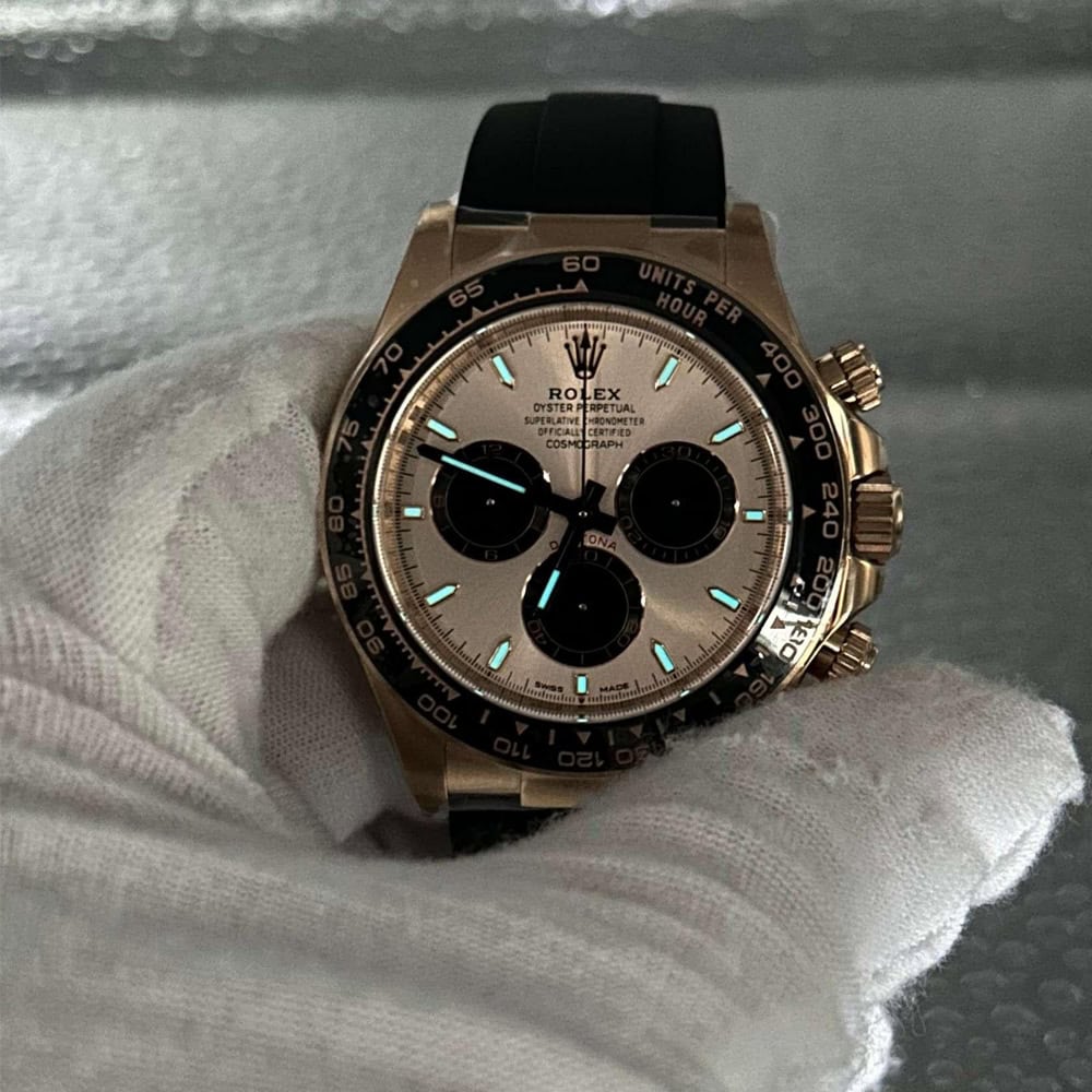 文字盤:ローズゴールド文字盤とブラックサブダイヤル、スティックマーカーと相まって、この時計のエレガンスさを表しております。 アワーマーカーと針にはスーパールミノバブルー蓄光コーティングされており、夜闇に9時間ぐらい視認性を確保できます。 クリーンファクトリーはあらゆるレーザーテキスト、プリント、刻印の精度がロレックス正規品と見分けがつけないことを確保しております。 アワーマーカーと針に施された18Kローズゴールドコーティングは時計の高級感を高めながら、色褪せすることを防止しております。