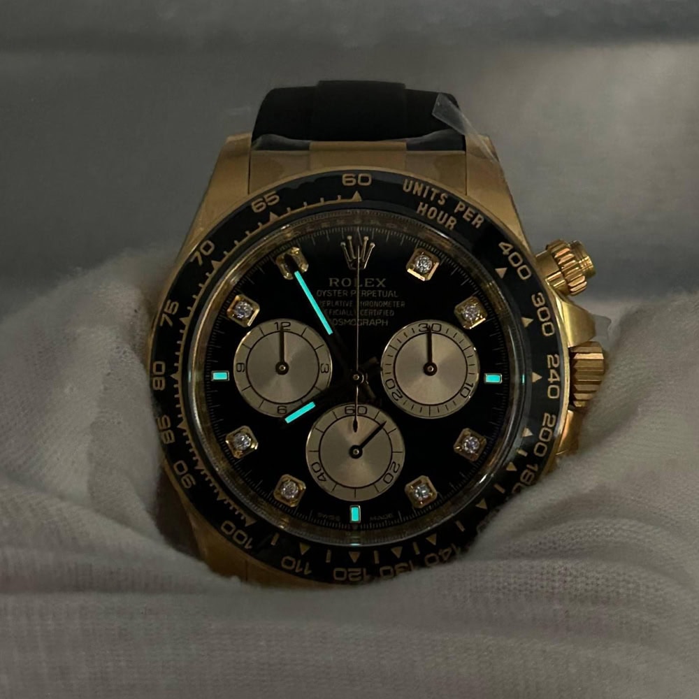 文字盤:ブラック文字盤とゴールデンのサブダイヤル、モアサナイトダイヤモンドのマーカーが相まって、この時計のエレガンスを引き立てています。アワーマーカーと針にはスーパールミノバブルー蓄光コーティングされており、夜闇に9時間ぐらい視認性を確保できます。 クリーンファクトリーはあらゆるレーザーテキスト、プリント、刻印の精度がロレックス正規品と見分けがつけないことを確保しております。 アワーマーカーと針に施された18Kイエローゴールドコーティングは時計の高級感を高めながら、色褪せすることを防止しております。
