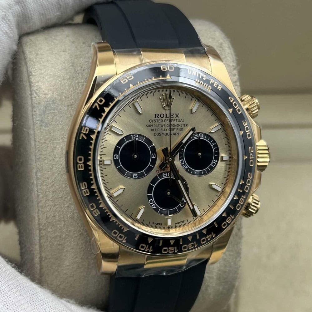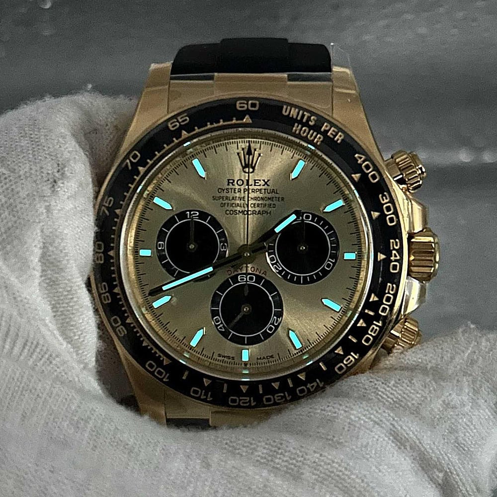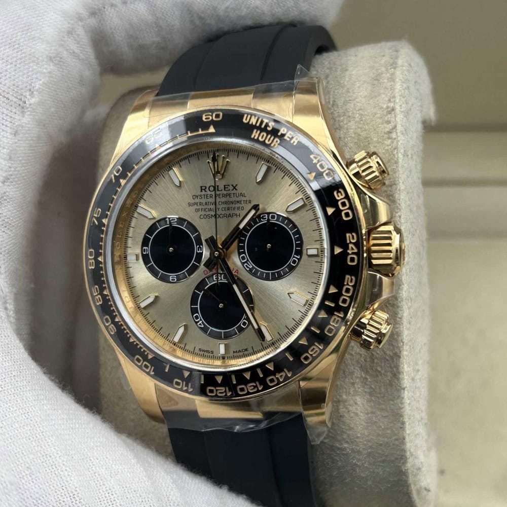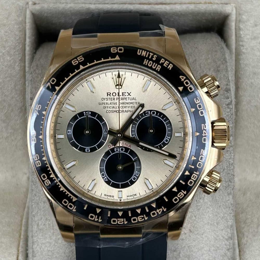 ケース:クリンファクトリーによるこのデイトナは本物18KイエローゴールドPVDコーティング加工された頑丈な904Lステンレススチールによって作りされております。40ミリのケースは完璧に正規品と一致しております。ケースは一体鍛造製法によって作り出されており、滑らかで洗練されたエッジが特徴です。頑丈なねじ込み式リューズはスイス製ラバー・シールと完璧に組み合わされております。RehautにはROLEXROLEXの刻印が刻まれており、あらゆる方面はロレックスデザインを一致しております。