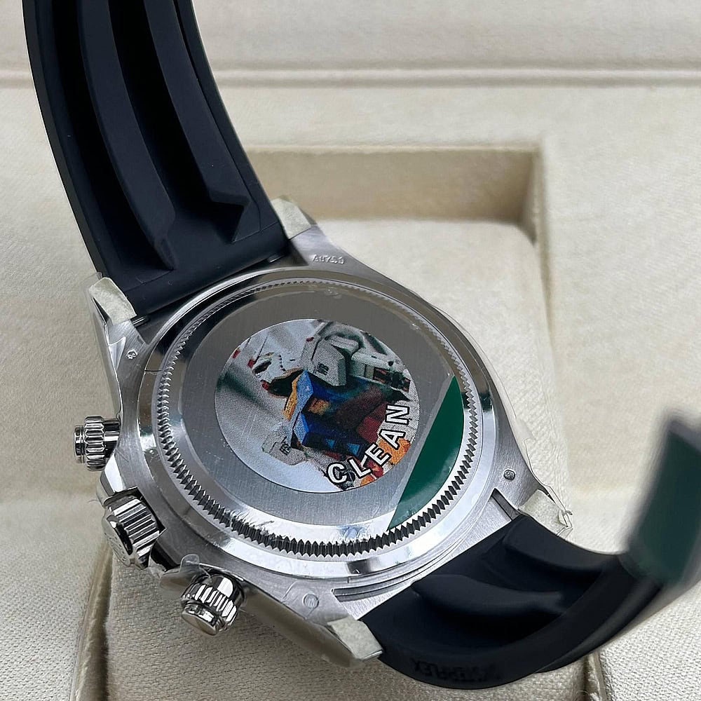 ケース:クリーンファクトリーのケース・エクセレンス:この40ミリモデルは18Kホワイトゴールドコーティングされたソリッド904Lステンレススチールによって作り出されおり、モノブロック構造はロレックス正規品と一致しております。この時計は合成ラバーで密封されたねじ込み式ケースパックとプッシュボタンを備えており、ロレックスデザインの完成性を維持しております。RehautリンクにROLEXROLEXレーザー刻印を刻まれており、DLCスクラッチプロティングコーティングはクリーンファクトリーがディテールへの拘りを証明しております。寸法から重さに至るまで、あらゆるディテールは完璧にロレックス正規品と一致するように還元されており、あらゆる部品は正規品と交換性があります。