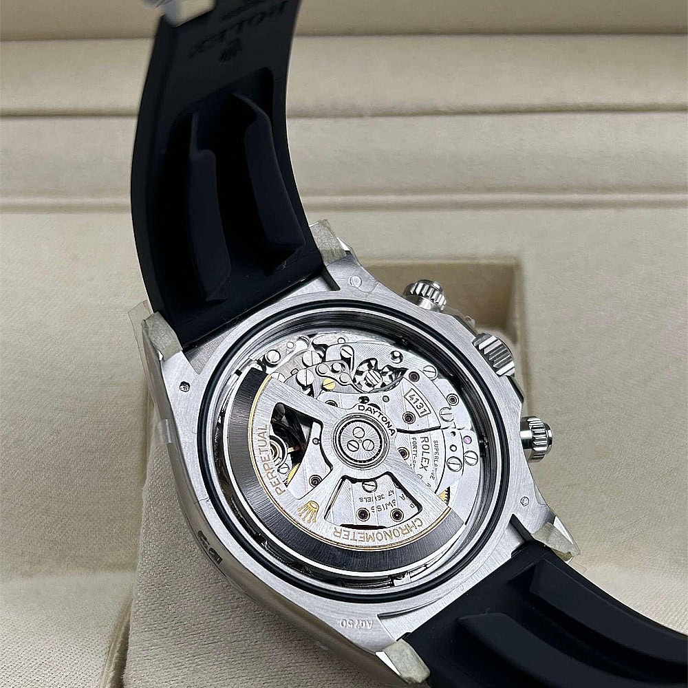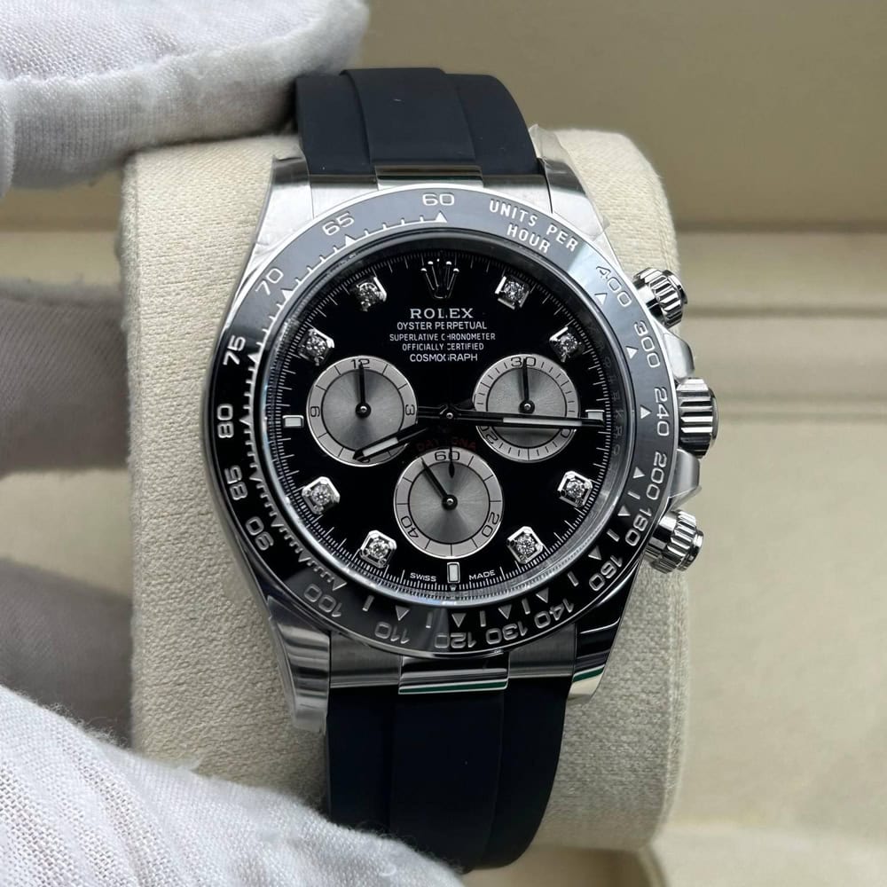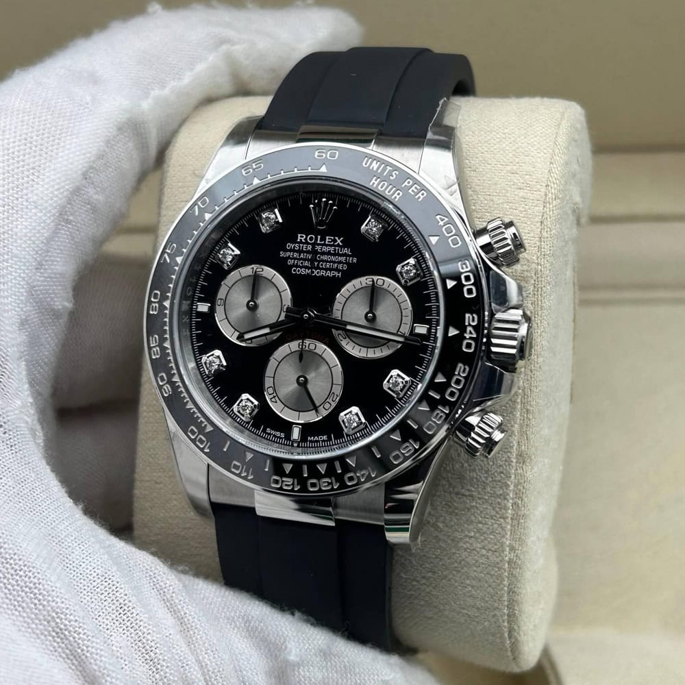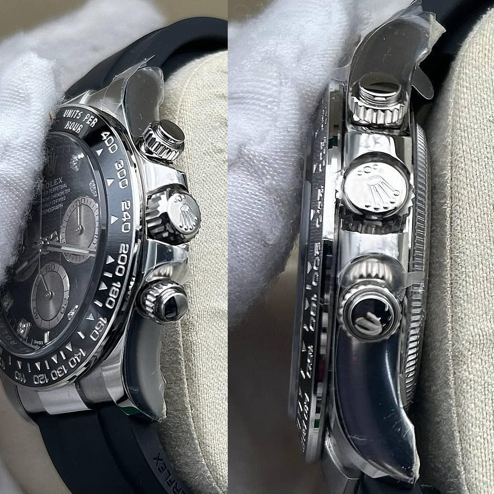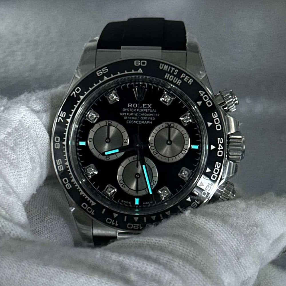 文字盤:文字盤は洗練された黒い背景にモアサナイトダイヤモンドのマーカーを配し、ホワイトゴールドのクロノグラフサブダイヤルがアクセントとなっています。アワーマーカーと針はスーパールミノバブルールミネッセンス蓄光塗料でコーティングされており、夜間に9時間まで均一に明るく発光できます。 これにより、ロレックス正規品と同じく、レーザーによる高精度のテキスト、プリント、刻印と相まって、高い可読性が保証されています。 更に、アワーマーカーと針には18kホワイトゴールドコーティングを施されたため、色落としません。 同時に、時計の高級感も高めています。