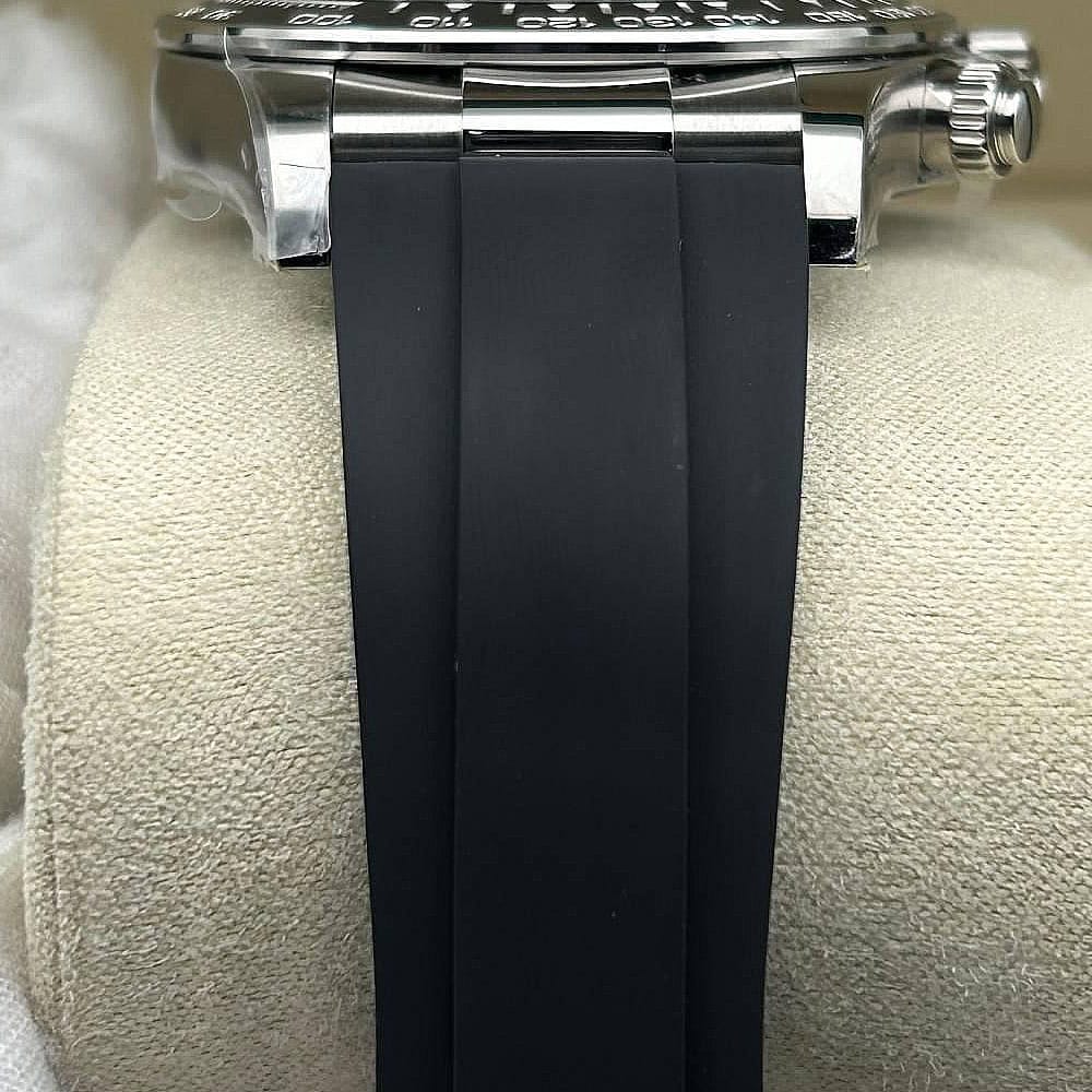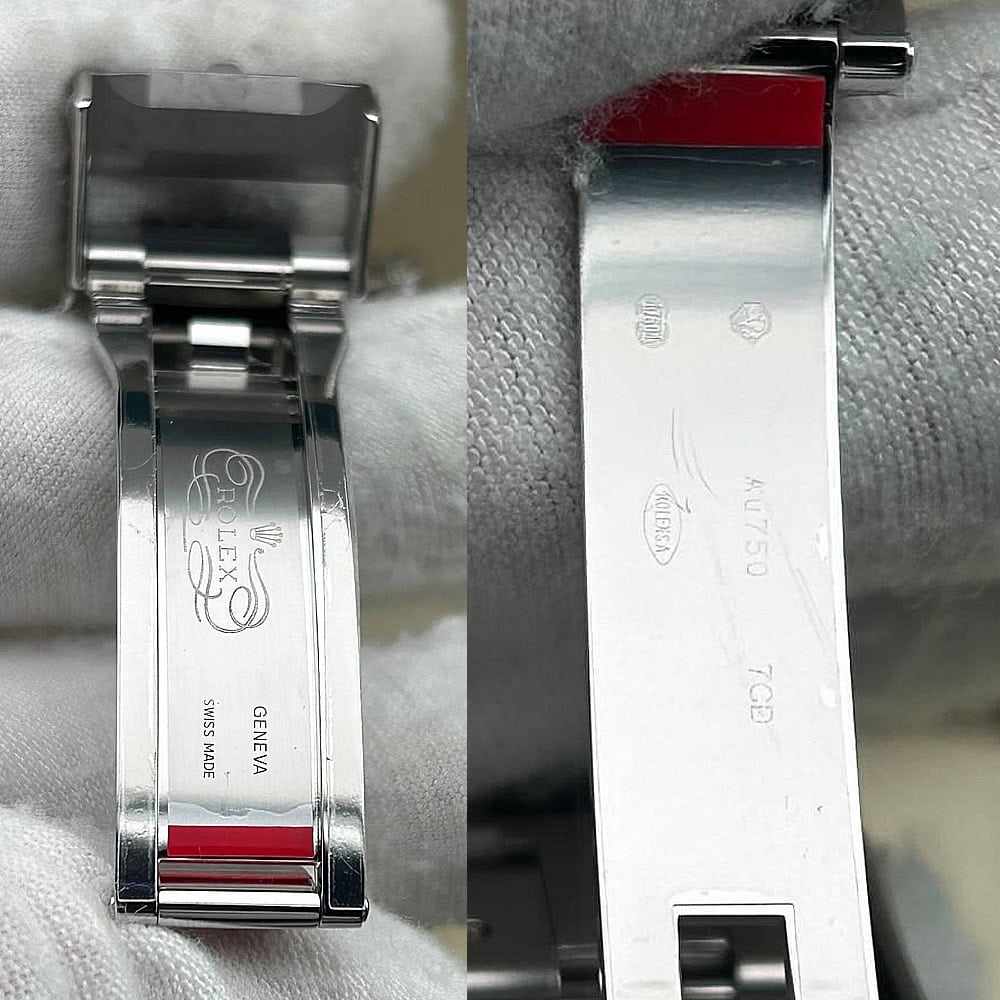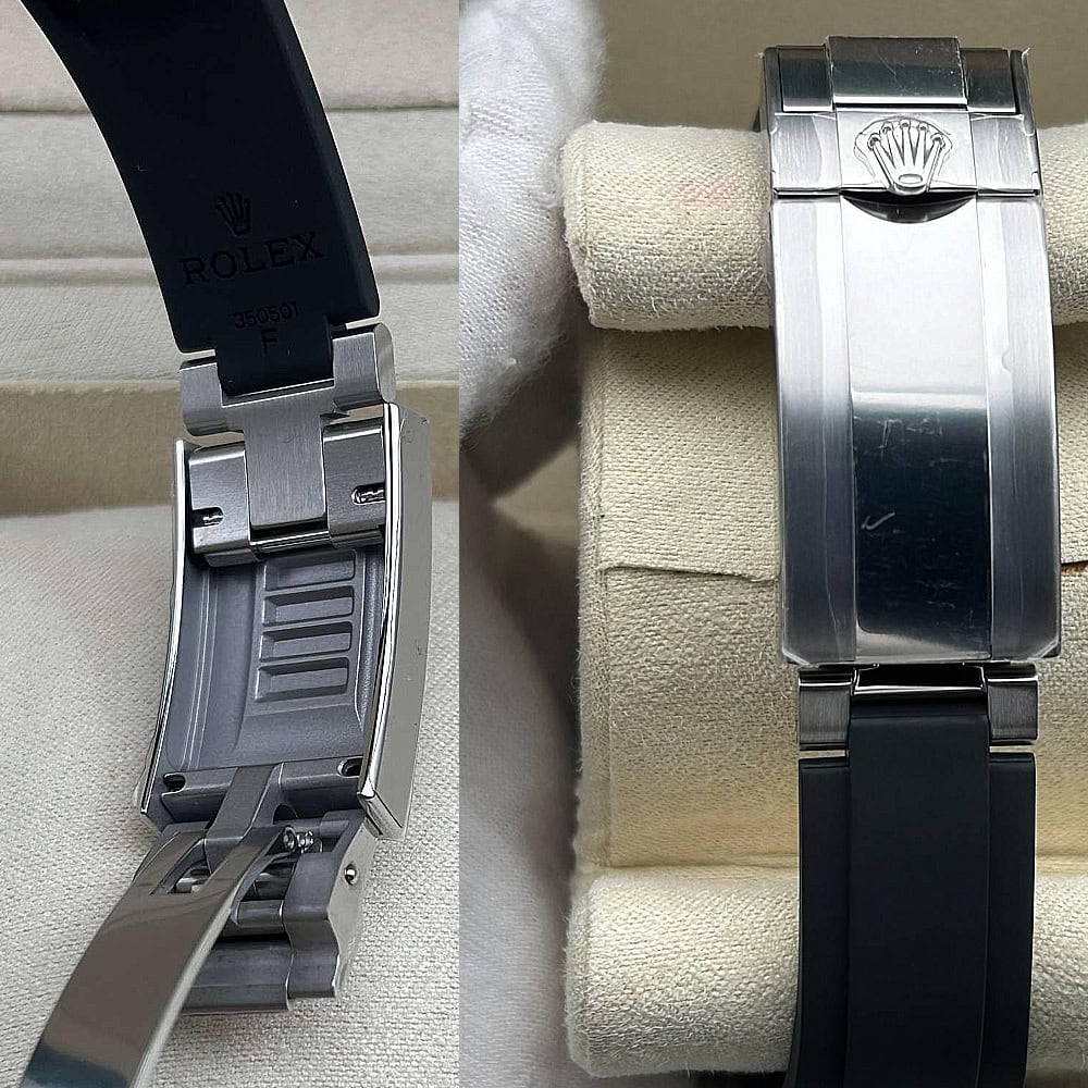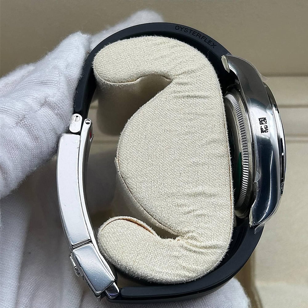 ベルト:メタルブレードの芯にブラックのエラストマーをオーバーモールドされた高性能のラバー製オイスターフレックス・ブレスレットは耐久性と快適性を備えております。ベルトには18kホワイトゴールドコーティングされたソリッドな904Lステンレススチールによって作り出された折畳式オイスター安全スクラップを備えており、確実なフィット感を確保しております。