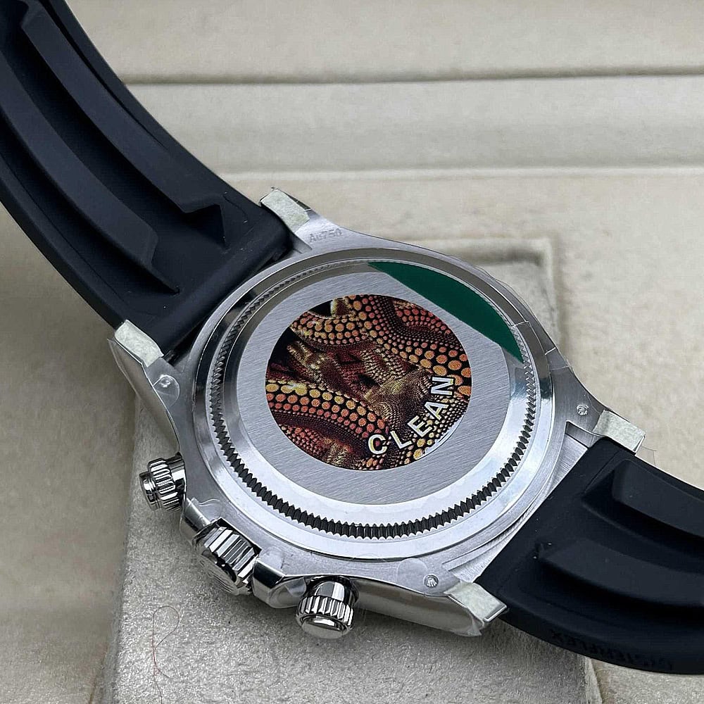 ムーブメント:クリーンファクトリーのエンジニアは4つのロレックス正規品ムーブメントを基づいて、専念に研究して、初の4131クローンムーブメントを作り上げました。精巧な技術と数え切れないほどの投資によって、クリーンファクトリーによる4131ムーブメントの厚さ約11.9MM、ロレックス正規品と一致させており、長期にわたって堅牢性と信頼性を確保しております。注意すべきなのはメインプレートです。ロレックスのバージョン4131ムーブメントのように、象徴的なコート・ド・ジュネーブストライプを見ることができます。このムーブメントは28,800 VPH (4Hz)で作動しており、精度は(-4+6秒/日)に抑えられており、パワーリザーブは約48時間です。センターセコンド針、3時位置の30分積算計、9時位置の12時間積算計を含むクロノグラフ機能は、時計製造における卓越性と革新性に対するクリーンファクトリーのコミットメントを際立たせております。