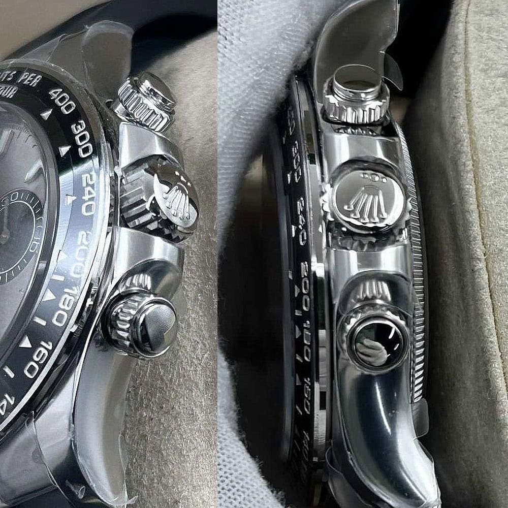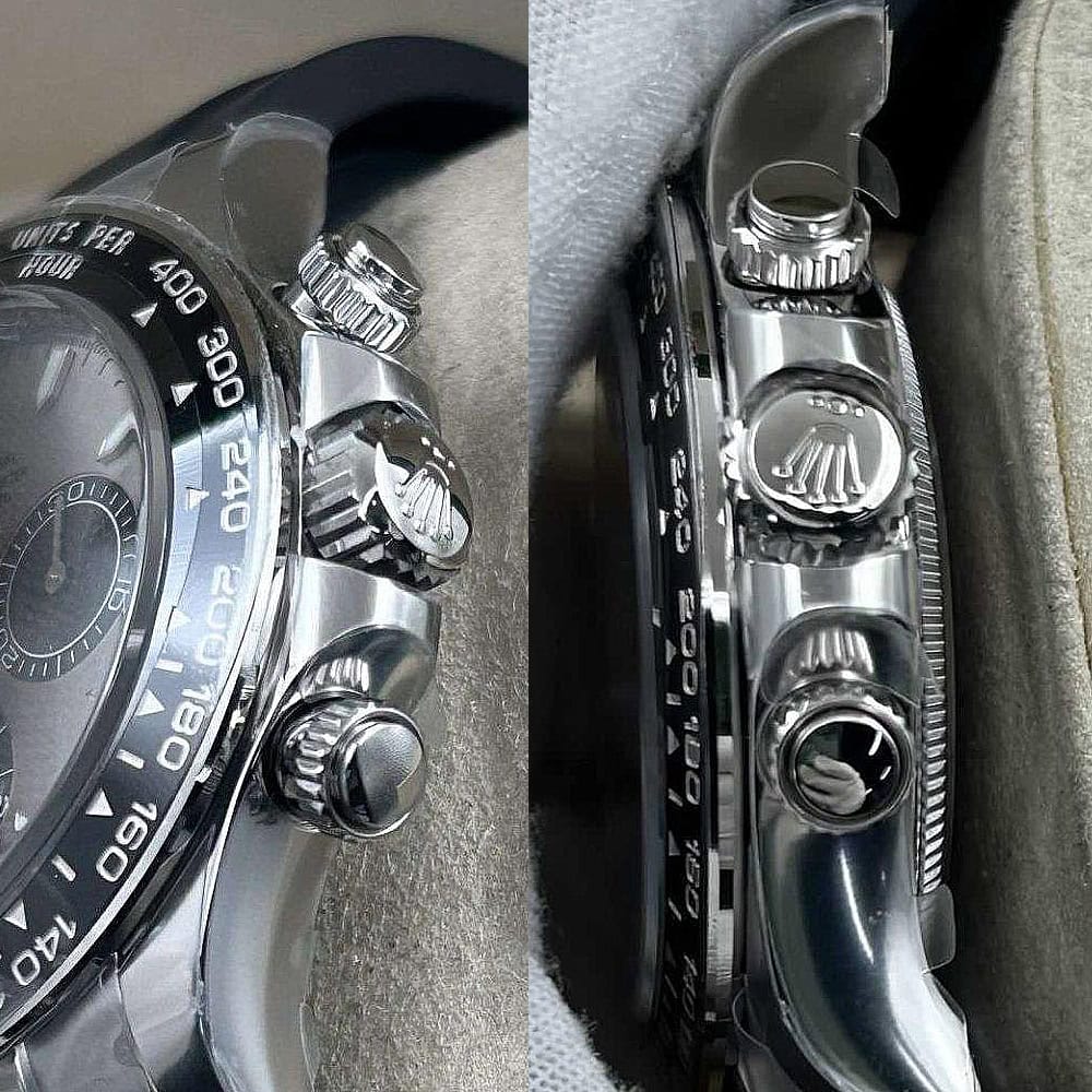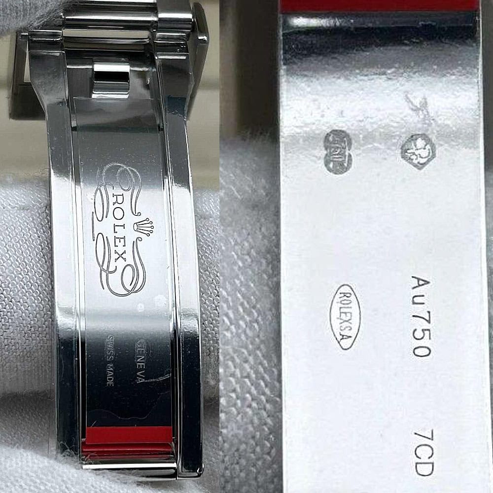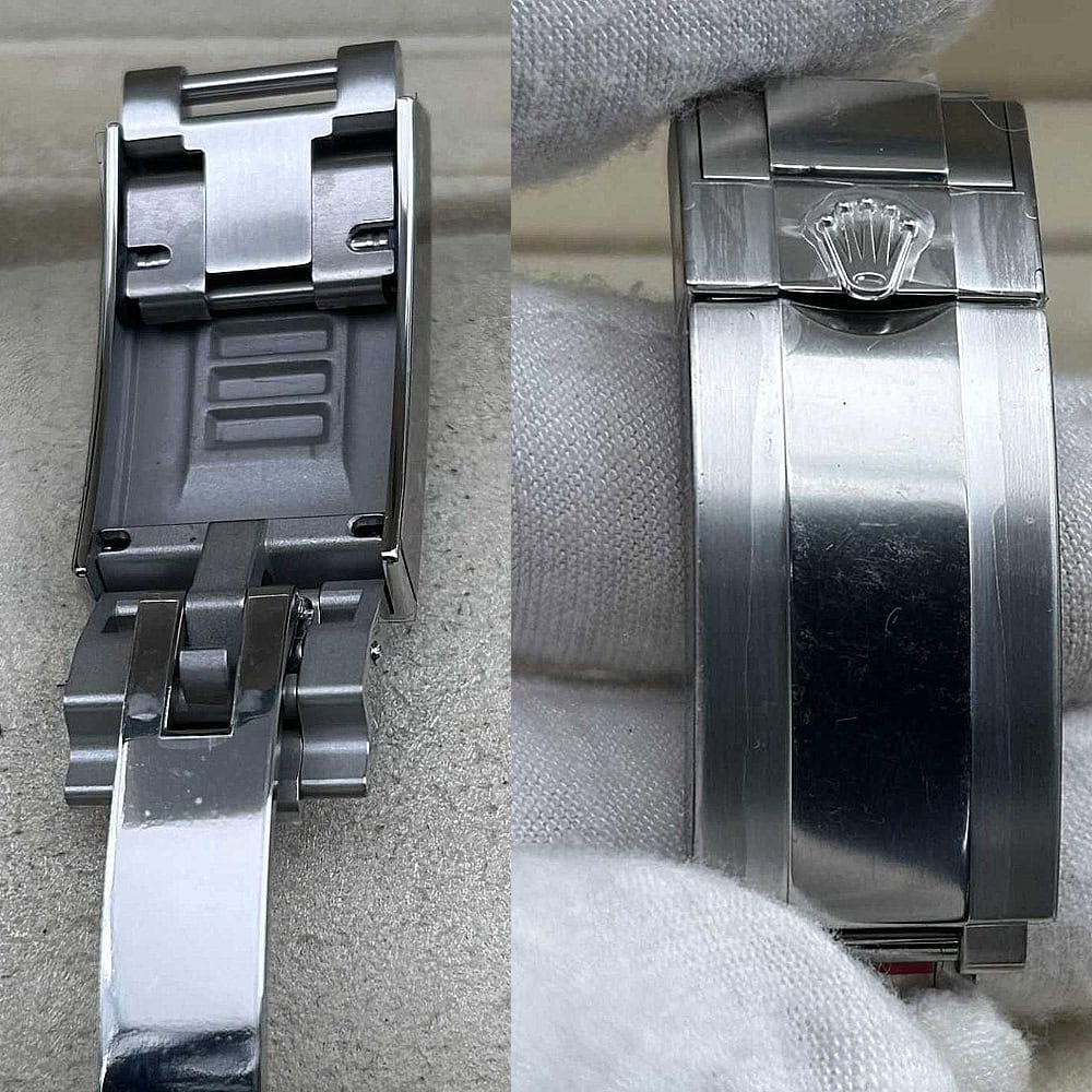 ケース:クリーンファクトリーのケース・エクセレンス:この40ミリモデルは18Kホワイトゴールドコーティングされたソリッド904Lステンレススチールによって作り出されおり、モノブロック構造はロレックス正規品と一致しております。この時計は合成ラバーで密封されたねじ込み式ケースパックとプッシュボタンを備えており、ロレックスデザインの完成性を維持しております。RehautリンクにROLEXROLEXレーザー刻印を刻まれており、DLCスクラッチプロティングコーティングはクリーンファクトリーがディテールへの拘りを証明しております。寸法から重さに至るまで、あらゆるディテールは完璧にロレックス正規品と一致するように還元されており、あらゆる部品は正規品と交換性があります。