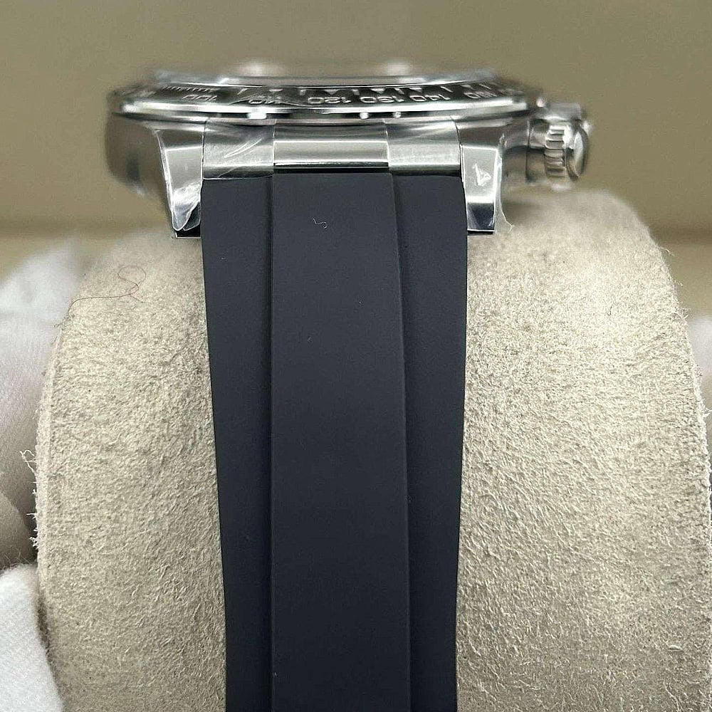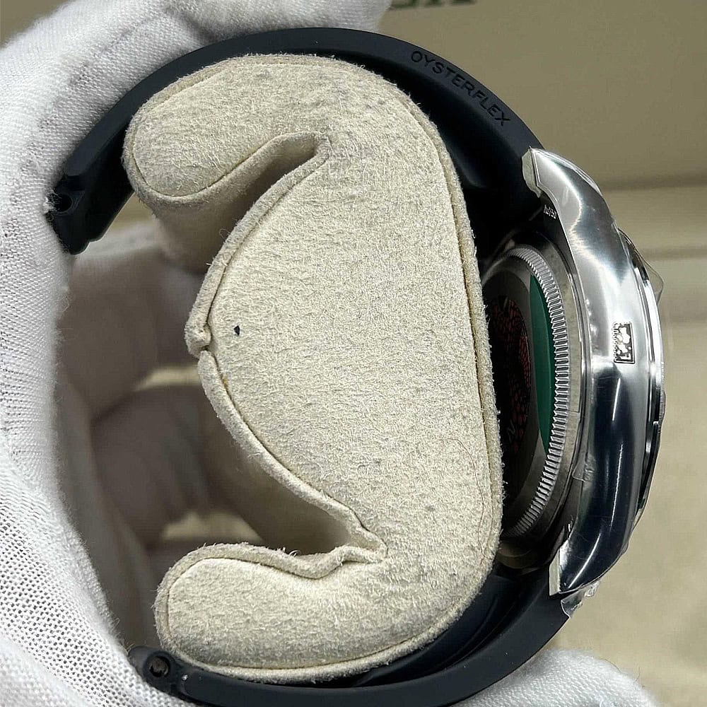 ベルト:メタルブレードの芯にブラックのエラストマーをオーバーモールドされた高性能のラバー製オイスターフレックス・ブレスレットは耐久性と快適性を備えております。ベルトには18kホワイトゴールドコーティングされたソリッドな904Lステンレススチールによって作り出された折畳式オイスター安全スクラップを備えており、確実なフィット感を確保しております。