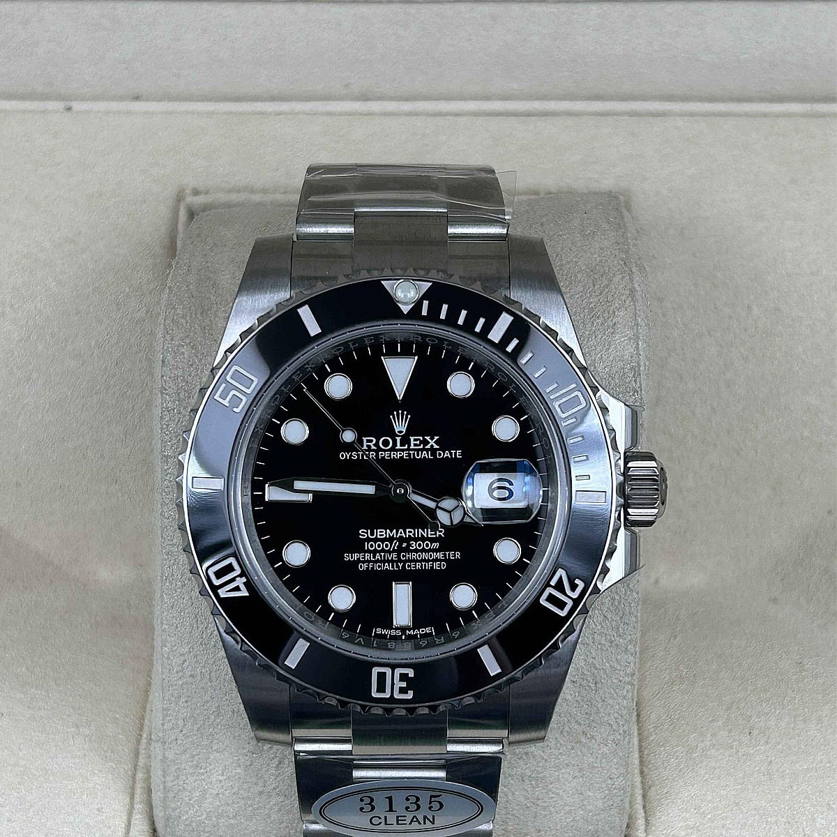 ベゼル:フェードに強いユニダイレクショナルブラックセラミックベゼルにプラチナのマーキングが施されています。クリーンファクトリー採用したエリートレベルのブラックセラミックベゼルは、その構成と着色技術がオリジナルのセラクロムセラミック外ベゼルの本質から派生しています。
