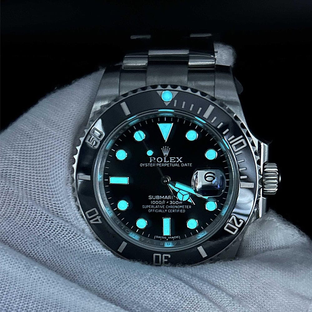 文字盤:クリーンファクトリーロレックススーパークローン時計には、ブラックラッカーダイアルが採用され、時マーカーと針には明るいルミノバブルーの蓄光コーティングが施されています。レーザー精密なテキスト、印刷、彫刻は本物のロレックス時計と同一です。さらに、変色を防ぐためにクリーンファクトリーはアワーマーカーと針には18金の白金が使用されています。