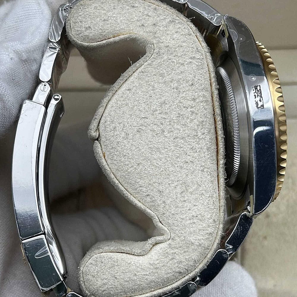 ベゼル:ベゼルは耐傷性ある頑丈なブラックセラミックインサートで飾られており、数字と目盛りは18Kイエローゴールドコーティングを施されています。120クリックで作動できる逆回転防止ベゼルには60分の目盛りがあります。スーパールミノバコーティングされたパールのデザインは正規品と100%同一で、すべてのティールは本物らしさを確保しています。