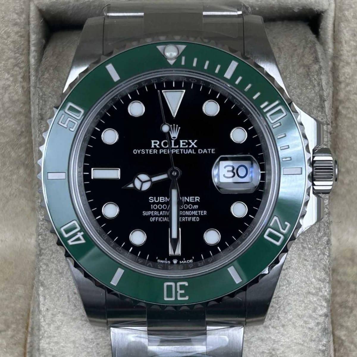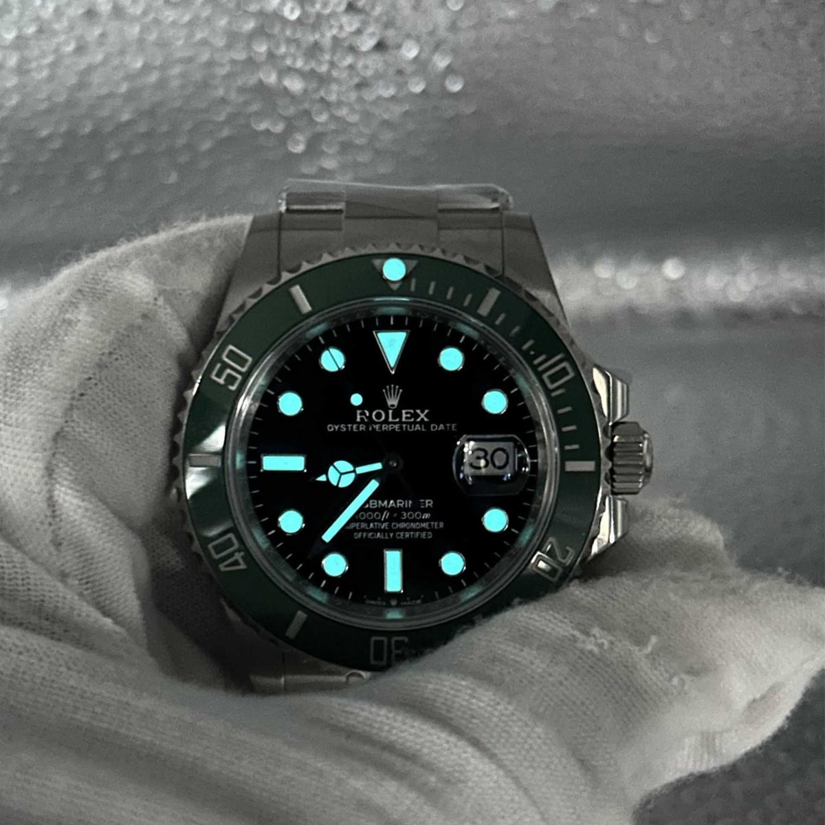 ベゼル:クリーンファクトリーは二酸化ケイ素を活用して、丹念に作り出されており、ナノ合金カラーリング加工を施されており、摂氏1200度で焼成された革新的なグリーンセラミックを採用しています。時計は優れた耐摩耗性と耐傷性を持ち、精密な逆回転防止60分積算計グリーン・ベゼルと、セラクロム・テクノロジーによるプラチナ製刻印マッキングを備えたセラミック製インナーが装備されています。