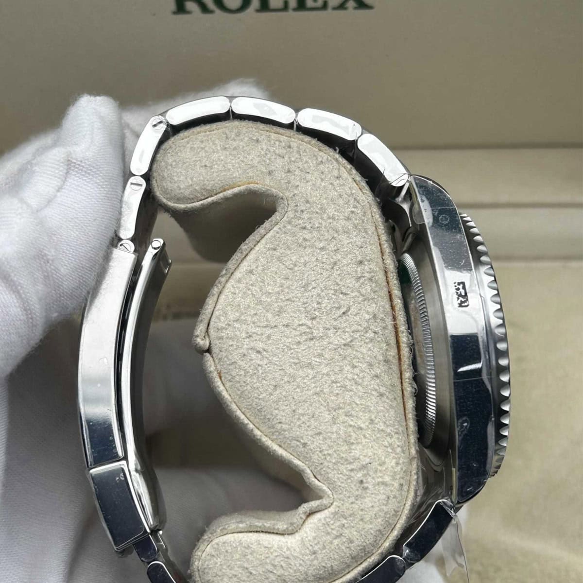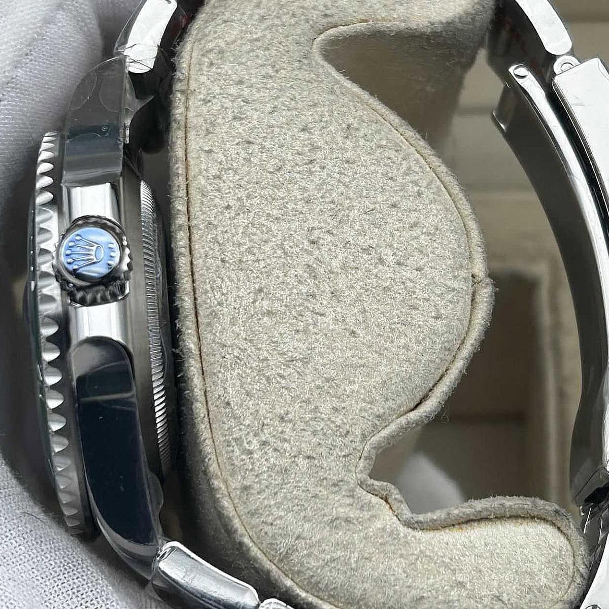 風防:クリーンファクトリーはその透明度と耐摩耗性能で知られた高反発サファイアを採用しています。その正確な高さはセラミックリンクと調和しています。2.5倍のサイクロプス・レンズを備えています。6時のところにはレザー刻印によるロレックス王冠ロゴがあります。