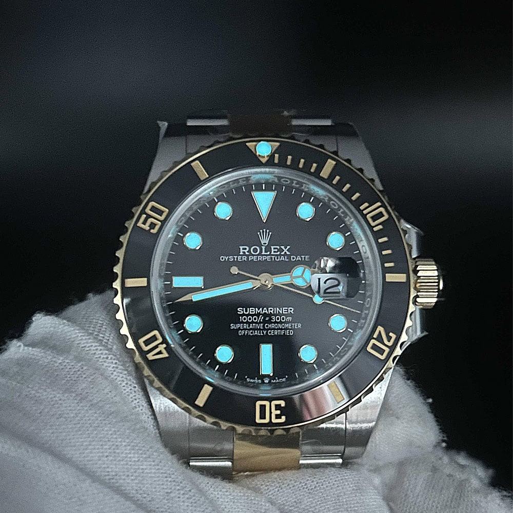 ベゼル:ベゼルは耐傷性ある頑丈なブラックセラミックインサートで飾られており、数字と目盛りは18Kイエローゴールドコーティングを施されています。120クリックで作動できる逆回転防止ベゼルには60分の目盛りがあります。スーパールミノバコーティングされたパールのデザインは正規品と100%同一で、すべてのティールは本物らしさを確保しています。